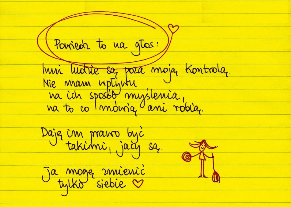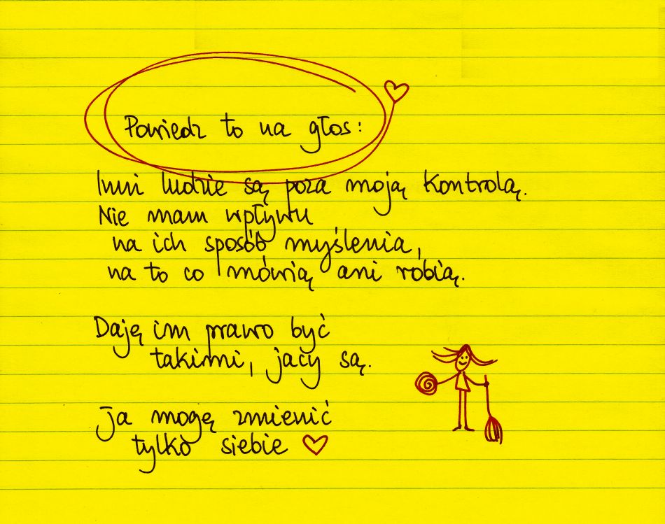 Powiedz to na głos: Inni ludzie są poza moja kontrolą. Nie mam wpływu na ich sposób myślenia, na to co mówią ani robią. Daję im prawo być takimi, jacy są. Ja mogę zmienić tylko siebie.