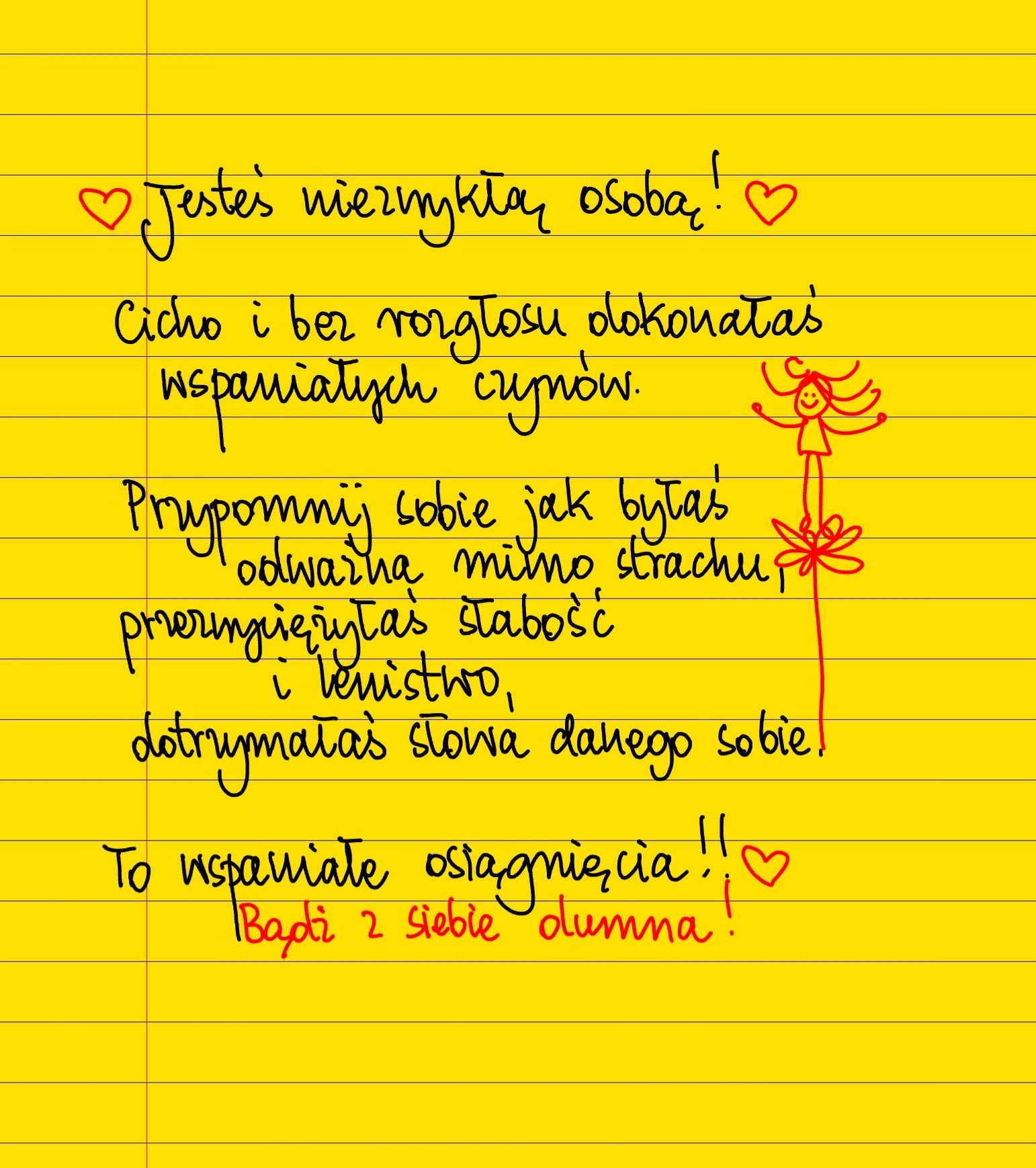 Jesteś niezwykłą osobą! Cicho i bez rozgłosu dokonałeś wspaniałych czynów. Przypomnij sobie jak byłeś odważny mimo strachu, przezwyciężyłeś słabość i lenistwo, dotrzymałeś słowa danego sobie. To wspaniałe osiągnięcia!! Bądź z siebie dumny! ❤ #żółtakartka