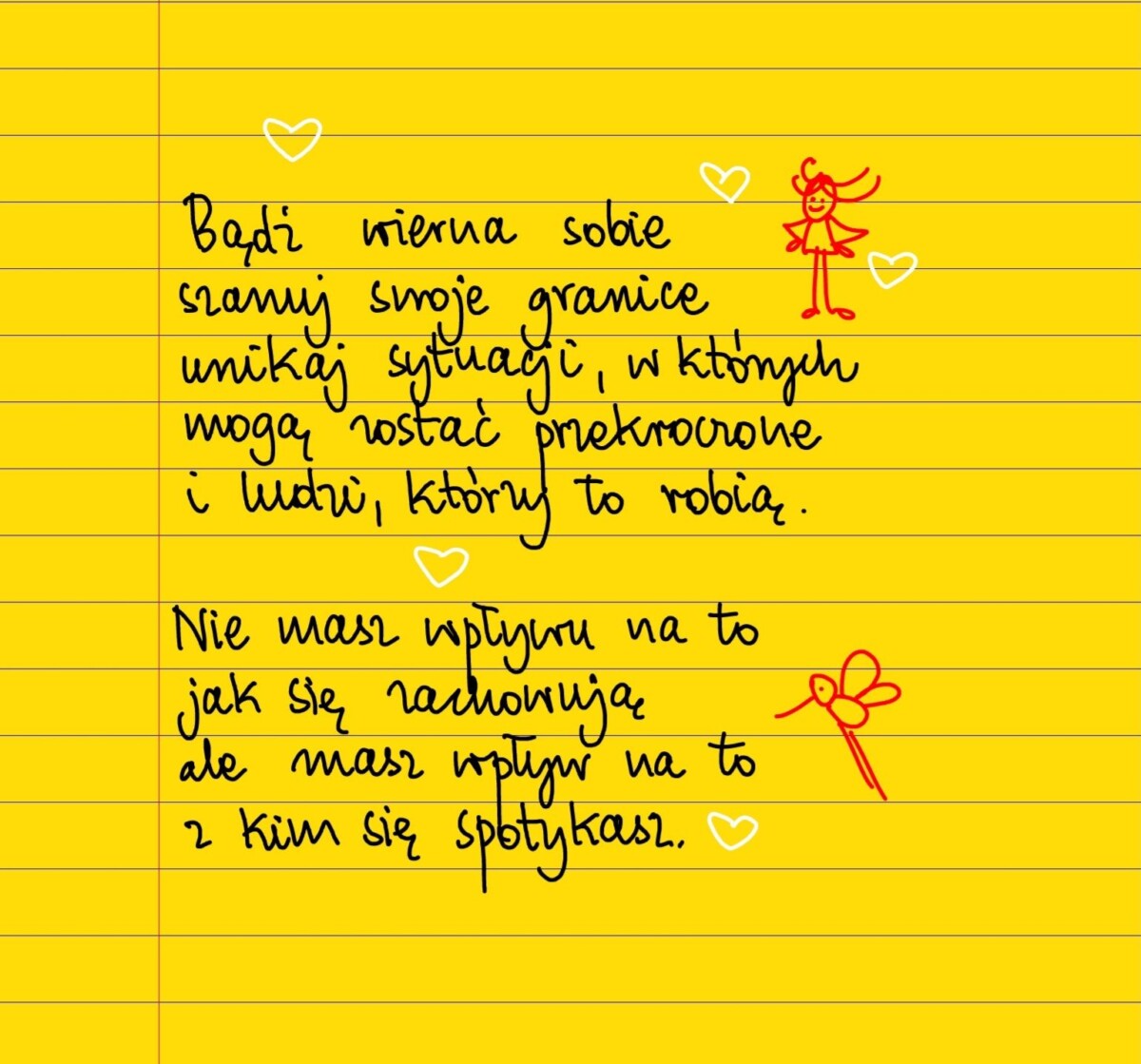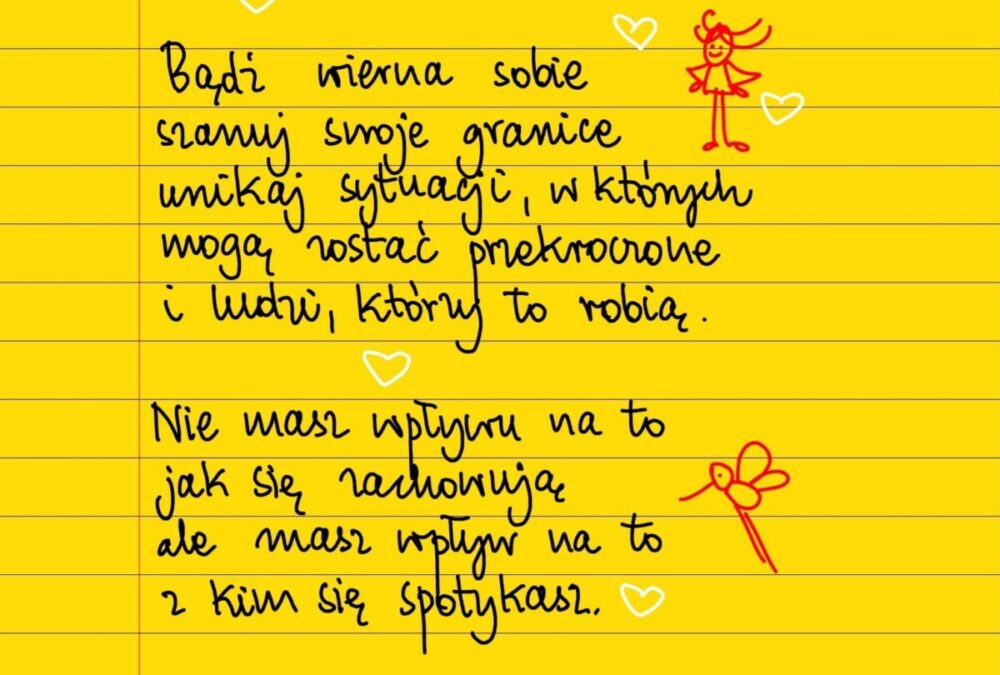 Bądź wierna sobie, szanuj swoje granice, unikaj sytuacji, wktorych mogą zostać przekroczone i ludzi, którzy to robią. Nie masz wpływu na to jak się zachowują, ale masz wpływ na to z kim się spotykasz. #żółtakartka