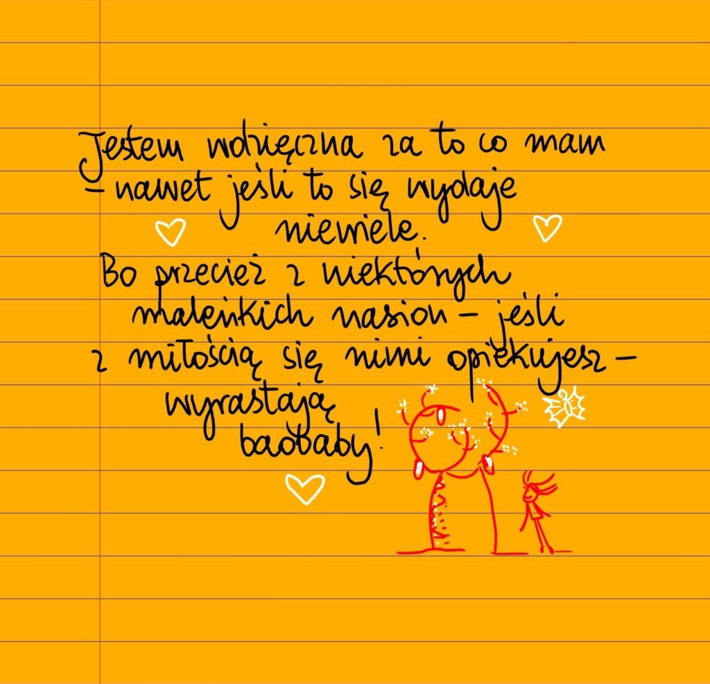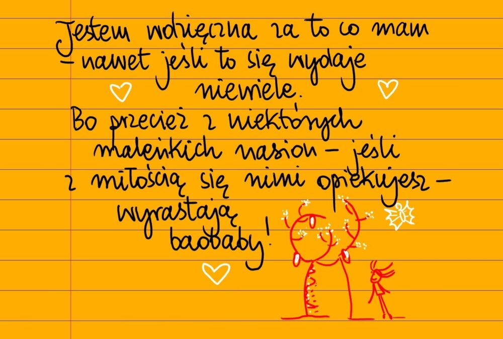 Żółte kartki Baobaby czwartek, 20.11.2025 Jestem wdzięczna za to co mam, nawet jeśli to się wydaje niewiele. Bo przecież z niektórych maleńkich nasion – jeśli tylko z miłością się nimi opiekujesz – wyrastają życiowe baobaby ❤ Udostępnij na Facebooku