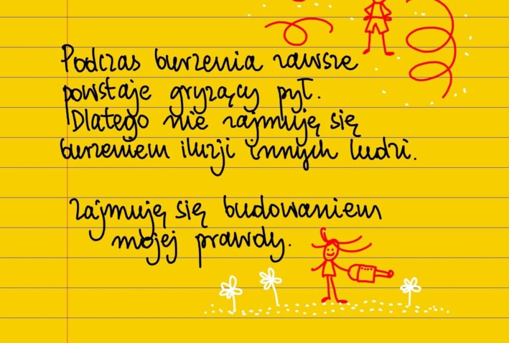 Żółte kartki Budowanie i burzenie piątek, 11.11.2022 Podcza burzenia zawsze powstaje gryzący pył. Dlatego nie zajmuję się burzeniem iluzji innych ludzi. Zajmuję się budowaniem mojej prawdy. #żółtakartka Udostępnij na Facebooku
