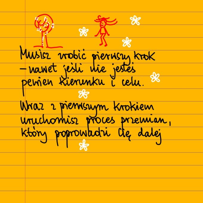 Musisz zrobić pierwszy krok, nawet jeżeli nie jesteś pewien kierunku ani celu. Wraz z pierwszym krokiem uruchomisz proces przemian, który poprowadzi cię dalej ❤