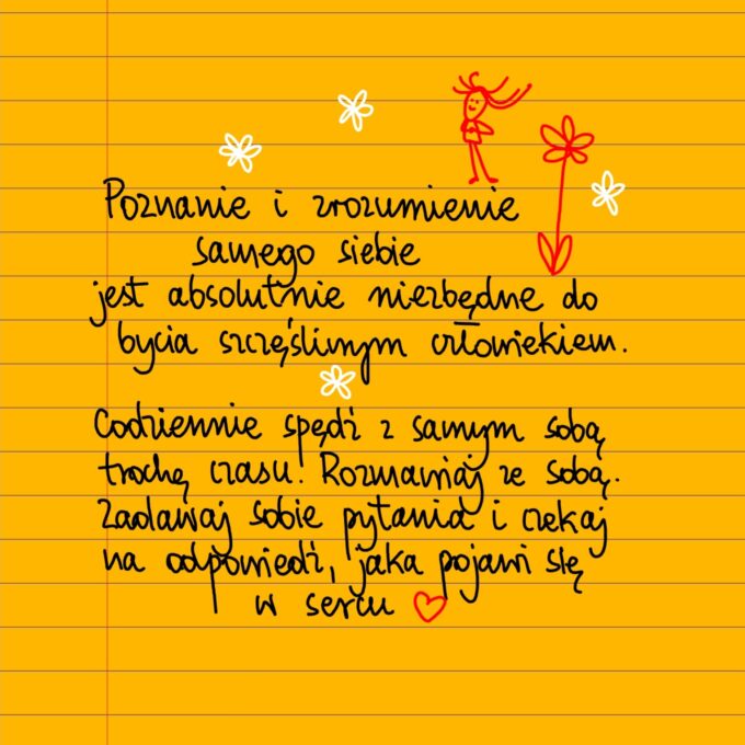 Poznanie i zrozumienie samego siebie jest absolutnie niezbędne do bycia szczęśliwym człowiekiem. Codziennie spędź z samym sobą trochę czasu. Rozmawiaj ze sobą. Zadawaj sobie pytania i czekaj na odpowiedź, jaka pojawi się w twoim sercu ❤