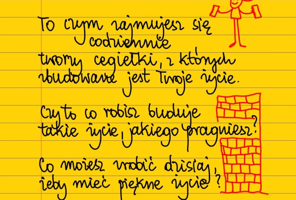 To czym zajmujesz się codziennie tworzy cegiełki, z których zbudowane jest twoje życie. Zastanów się dzisiaj czy to co robisz buduje takie życie, jakiego pragniesz? Jeśli nie, to co możesz dodać do swojego dnia, żeby przybliżyć się do swoich marzeń? #żółtakartka