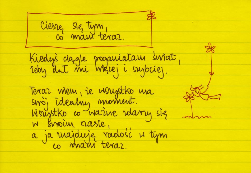 Cieszę się tym, co mam TERAZ. Kiedyś ciągle poganiałam świat, żeby dał mi więcej i szybciej. Teraz wiem, że wszystko ma swój idealny moment. Wszystko, co ważne, zdarzy się w swoim czasie, a ja znajduję radość w tym, co mam teraz ❤ #żółtakartka #beatapawlikowska