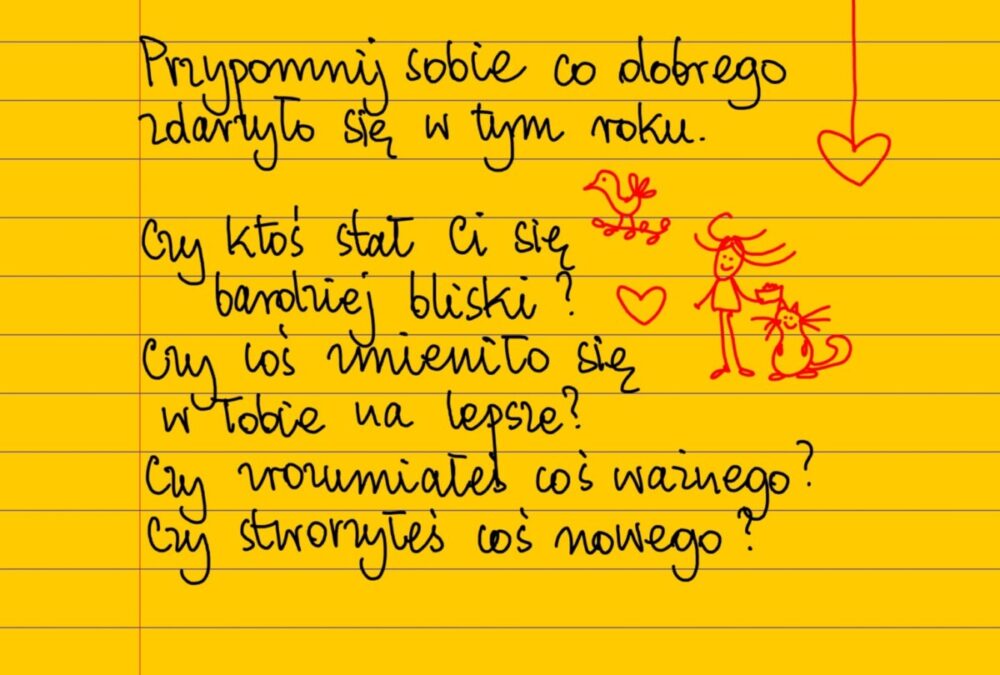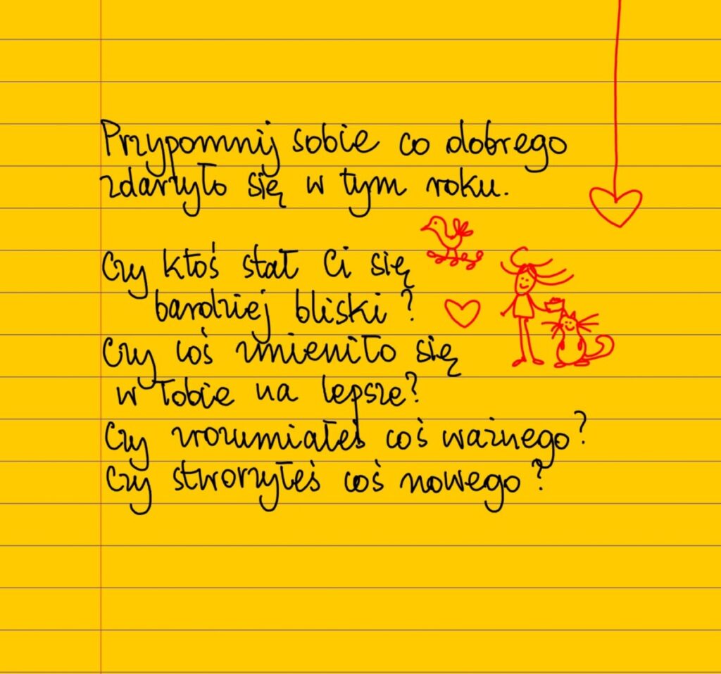 Przypomnij sobie co dobrego zdarzyło się w tym roku. Czy ktoś stał ci się bardziej bliski? Czy coś zmieniło się w Tobie na lepsze? Czy zrozumiałeś coś waznego? Czy stworzyłeś coś nowego? #żółtakartka