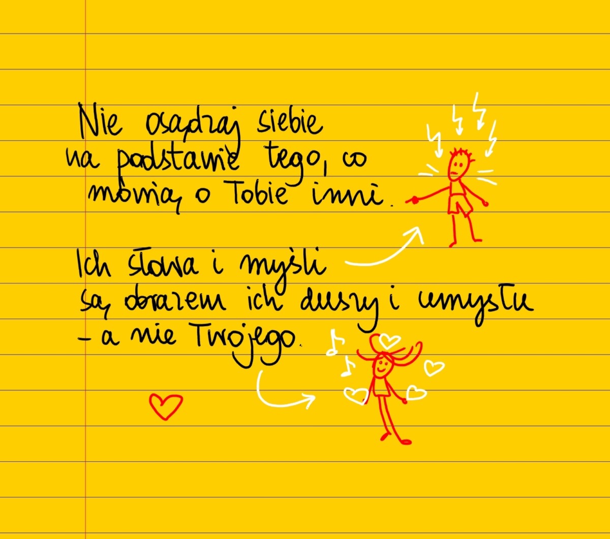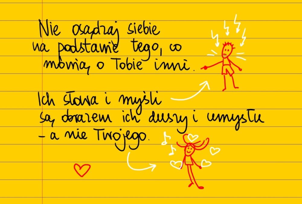 Żółte kartki Co mówią inni czwartek, 08.12.2022 Nie osądzaj siebie na podstawie tego co mówią o tobie inni. Ich słowa i myśli są obrazem stanu ich duszy i umysłu, a nie twojego. #żółtakartka Udostępnij na Facebooku