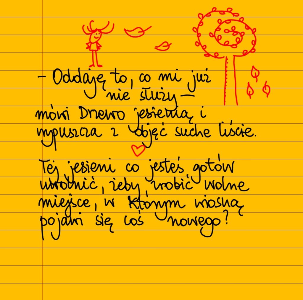 – Oddaję to, co mi już nie służy – mówi Drzewo jesienią i łagodnie wypuszcza z objęć żółte liście. Gdybyś był Drzewem tej jesieni, jaką jedną rzecz byłbyś gotów uwolnić po to, żeby zrobić wolne miejsce, w którym wiosną wyrośnie coś nowego? #żółtakartka