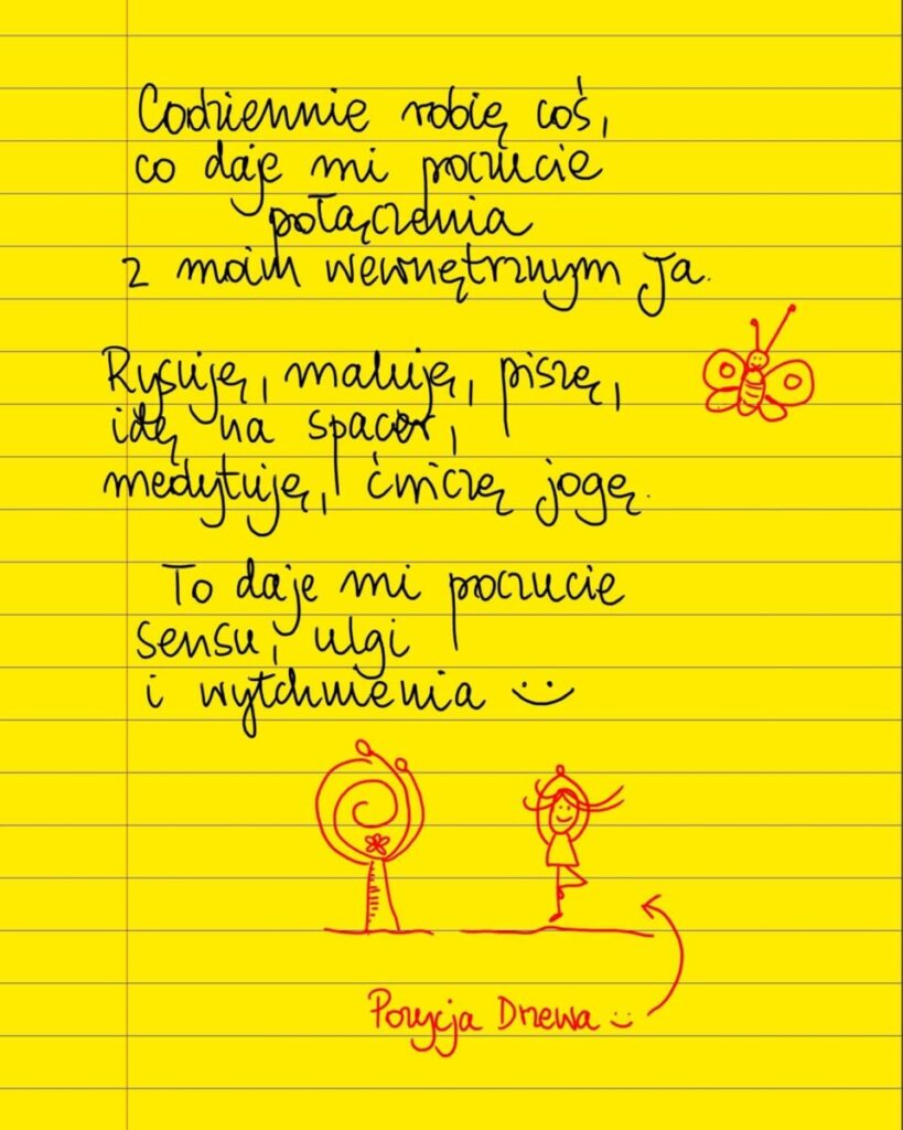 Żółte kartki Codziennie robię coś wtorek, 13.07.2021 Codziennie robię coś, co daje mi poczucie połączenia z moim wewnętrznym Ja. Rysuję, maluję, piszę, idę na spacer, medytuję, ćwiczę jogę. To daje mi poczucie sensu, ulgi i wytchnienia 🙂 #żółtakartka Udostępnij na Facebooku