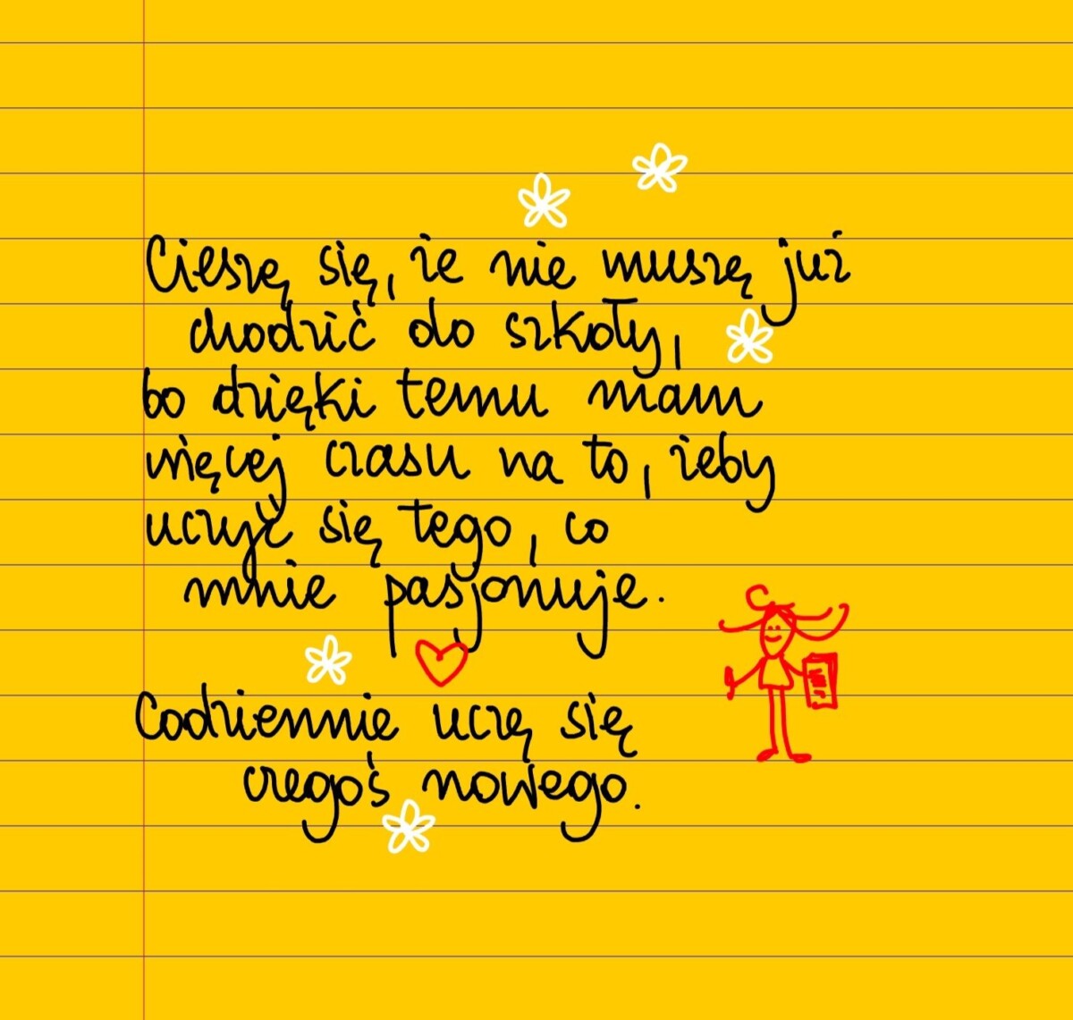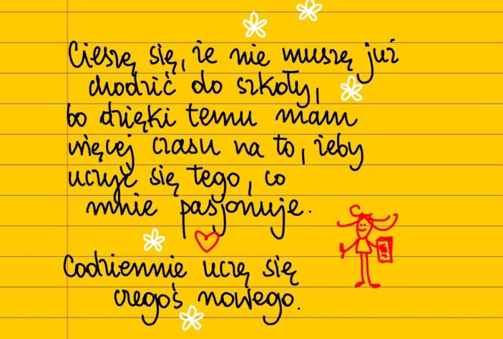 Żółte kartki Codziennie uczę się czegoś nowego czwartek, 01.09.2022 Cieszę się, że nie muszę już chodzić do szkoły, bo dzięki temu mam więcej czasu na to, żeby uczyć się tego, co mnie pasjonuje. Codziennie uczę się czegoś nowego. #żółtakartka Udostępnij na Facebooku