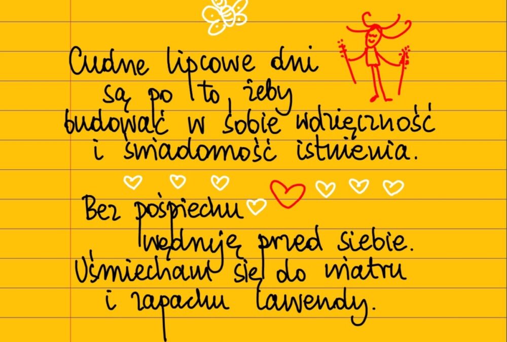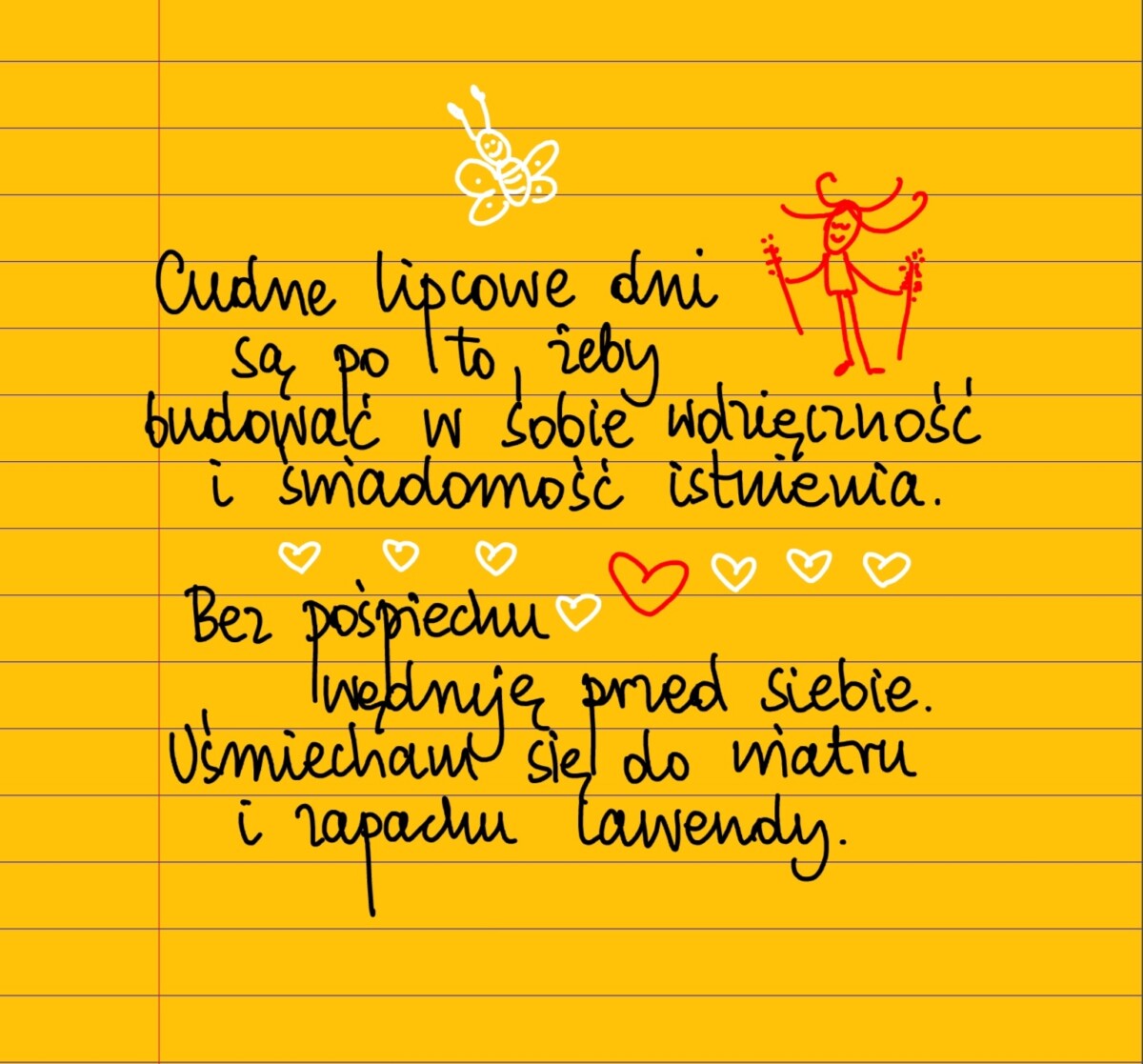 Cudne lipcowe dni są po to, żeby budować w sobie wdzięczność i świadomość istnienia. Bez pośpiechu wędruję przed siebie. Uśmiecham się do wiatru i zapachu lawendy. #żółtakartka