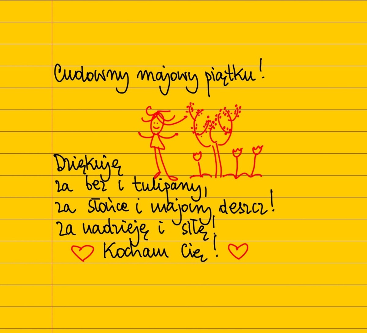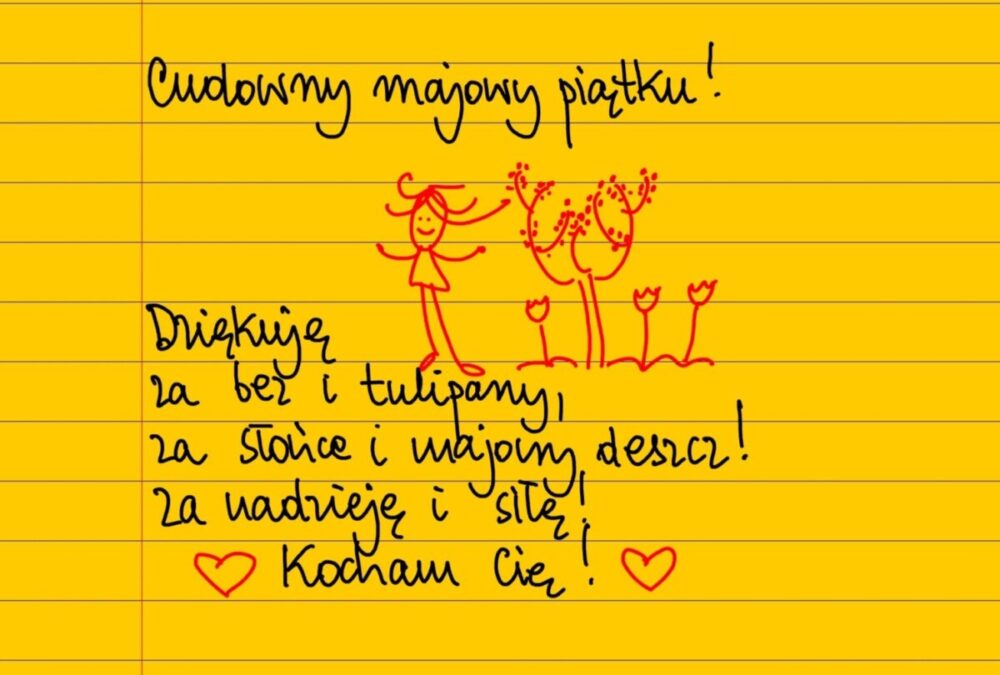 Żółte kartki Cudowny majowy piątku piątek, 07.05.2021 Cudowny majowy piątku! Dziękuję za bez i tulipany, za słońce i majowy deszcz! Za nadzieję i siłę! Kocham Cię! #żółtakartka Udostępnij na Facebooku