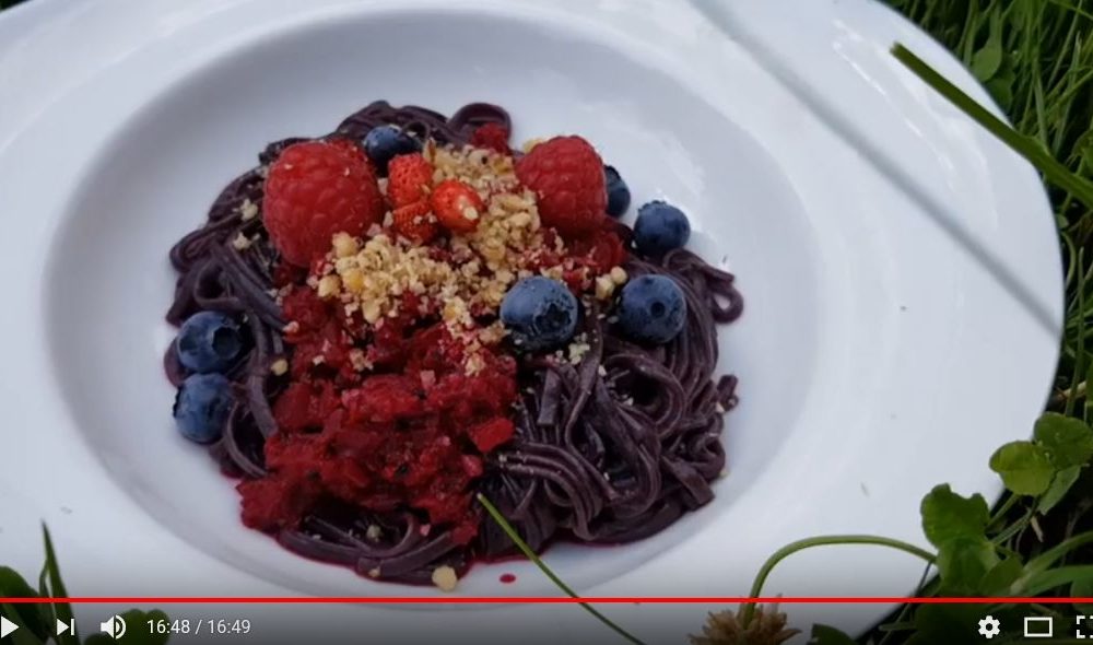 Filmy Kuchnia Czarny makaron z burakami i poziomkami sobota, 23.06.2018 Czarny ryżowy makaron z malinowym sosem z buraków, podany z poziomkami, malinami i borówkami. Udostępnij na Facebooku
