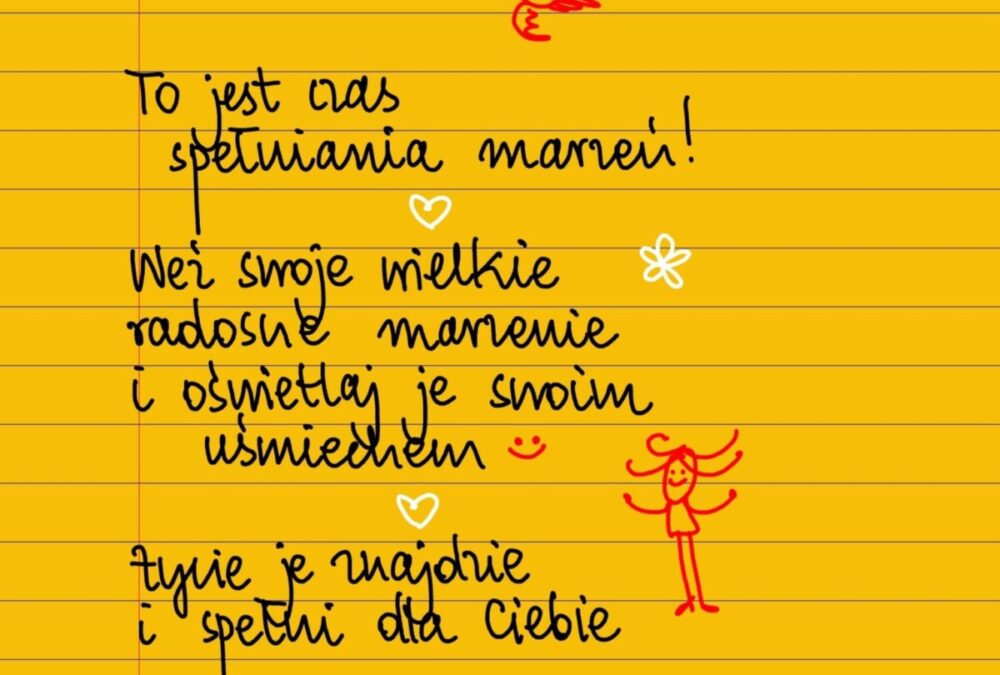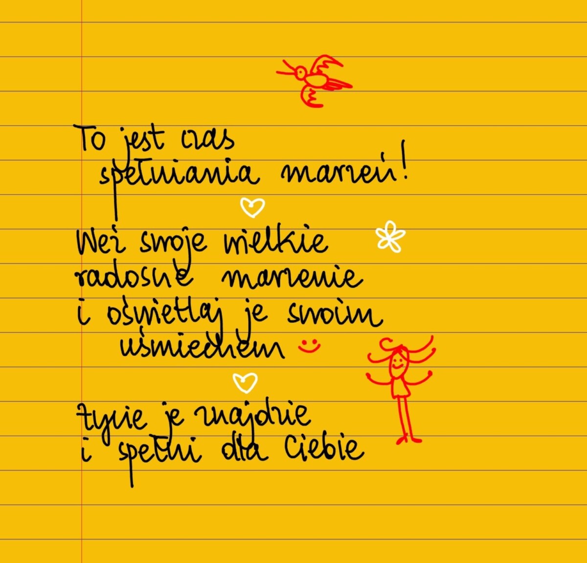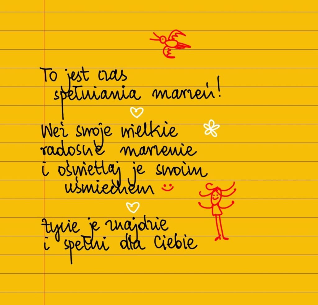 Żółte kartki Czas spełniania marzeń czwartek, 18.08.2022 To jest czas spełniania marzeń! Weź swoje wielkie radosne marzenie i oświetlaj je swoim uśmiechem. Życie je znajdzie i spełni dla ciebie 😊 #żółtakartka Udostępnij na Facebooku