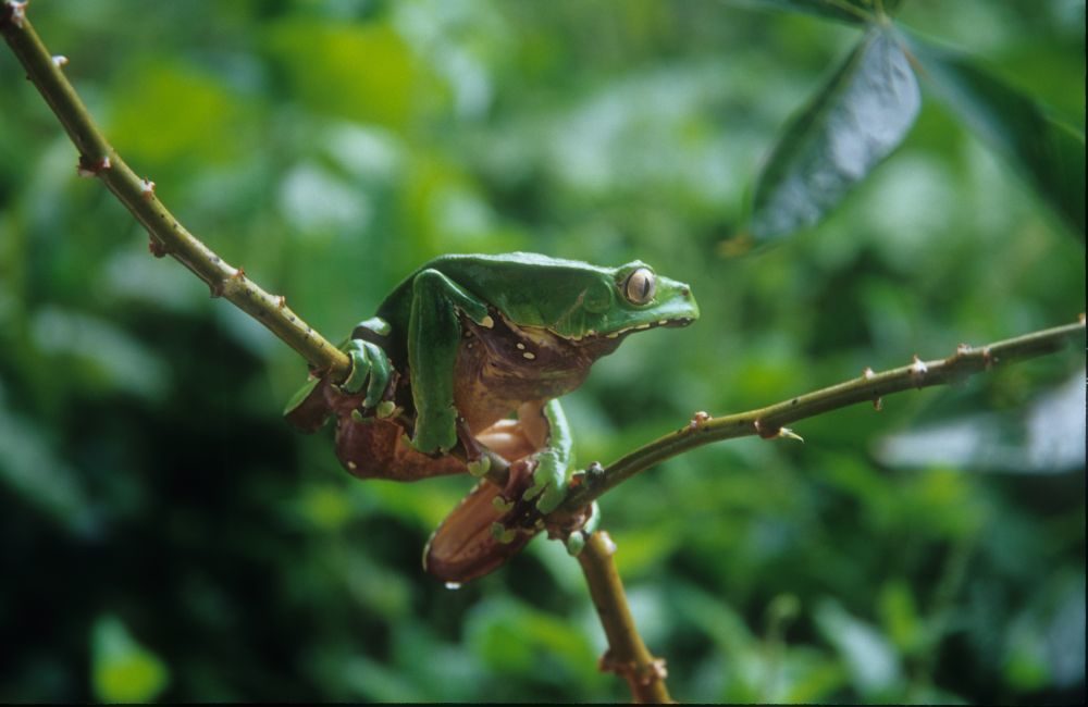 – Żaba czerwonooka spędza większość życia na gałęziach drzew, doskonale potrafi też skakać. W ciągu dnia leży bez ruchu, przykrywając tylnymi nogami jaskrawo niebieskie podłużne pasy na bokach.