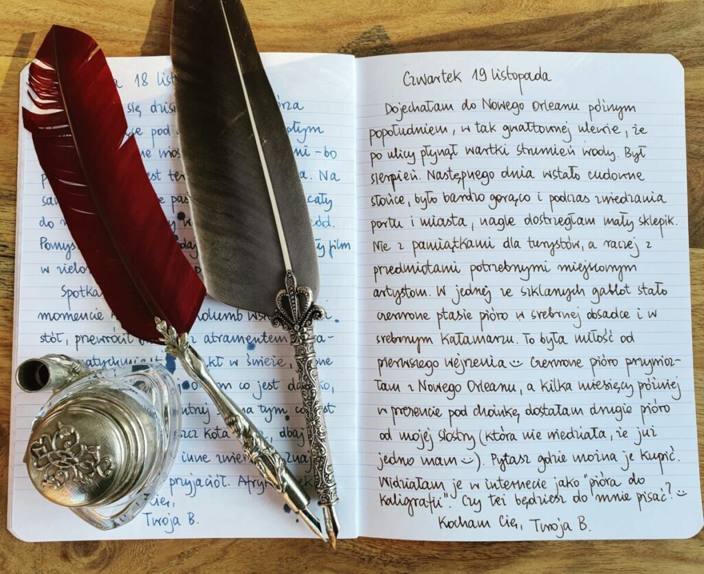 Dojechałam do Nowego Orleanu późnym popołudniem, w tak gwałtownej ulewie, że po ulicy płynął wartki strumień wody. Był sierpień. Następnego dnia wstało cudowne slońce, było bardzo gorąco i podczas zwiedzania portu i miasta, nagle dostrzegłam mały sklepik. Nie z pamiątkami dla turystów, a raczej z przedmiotami potrzebnymi miejscowym artystom. W jednej ze szklanych gablot stało czerwone ptasie pióro w srebrnej obsadce i w srebrnym kałamarzu. To była miłość od pierwszego wejrzenia 😊
