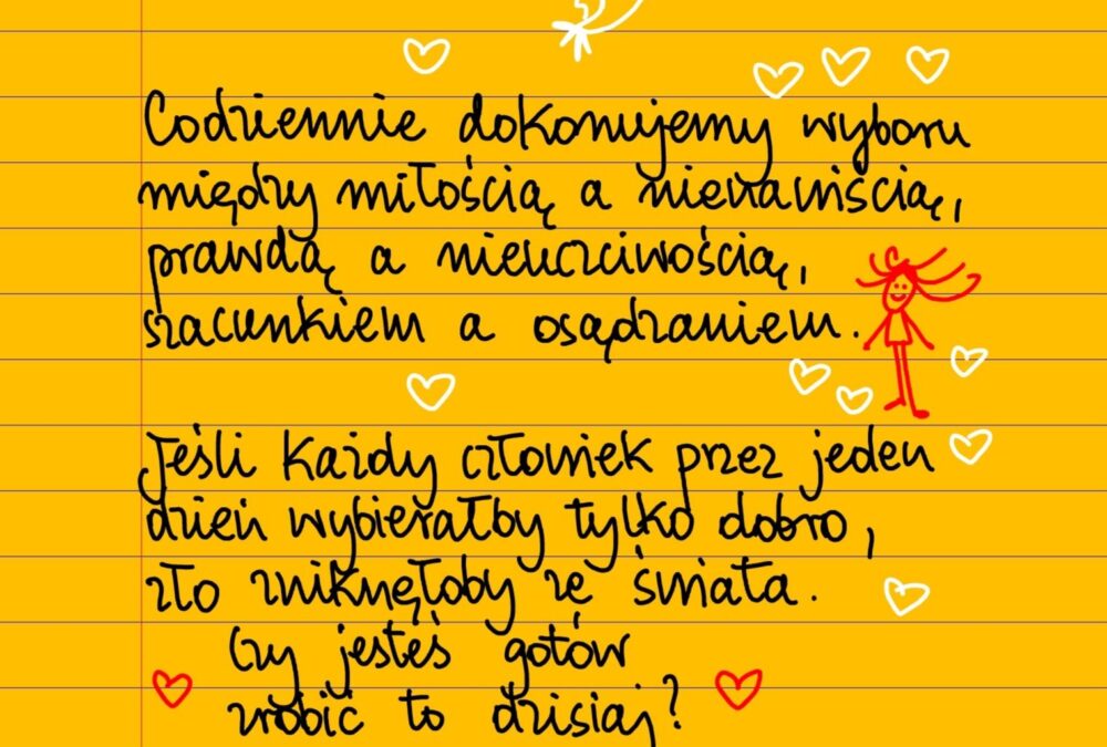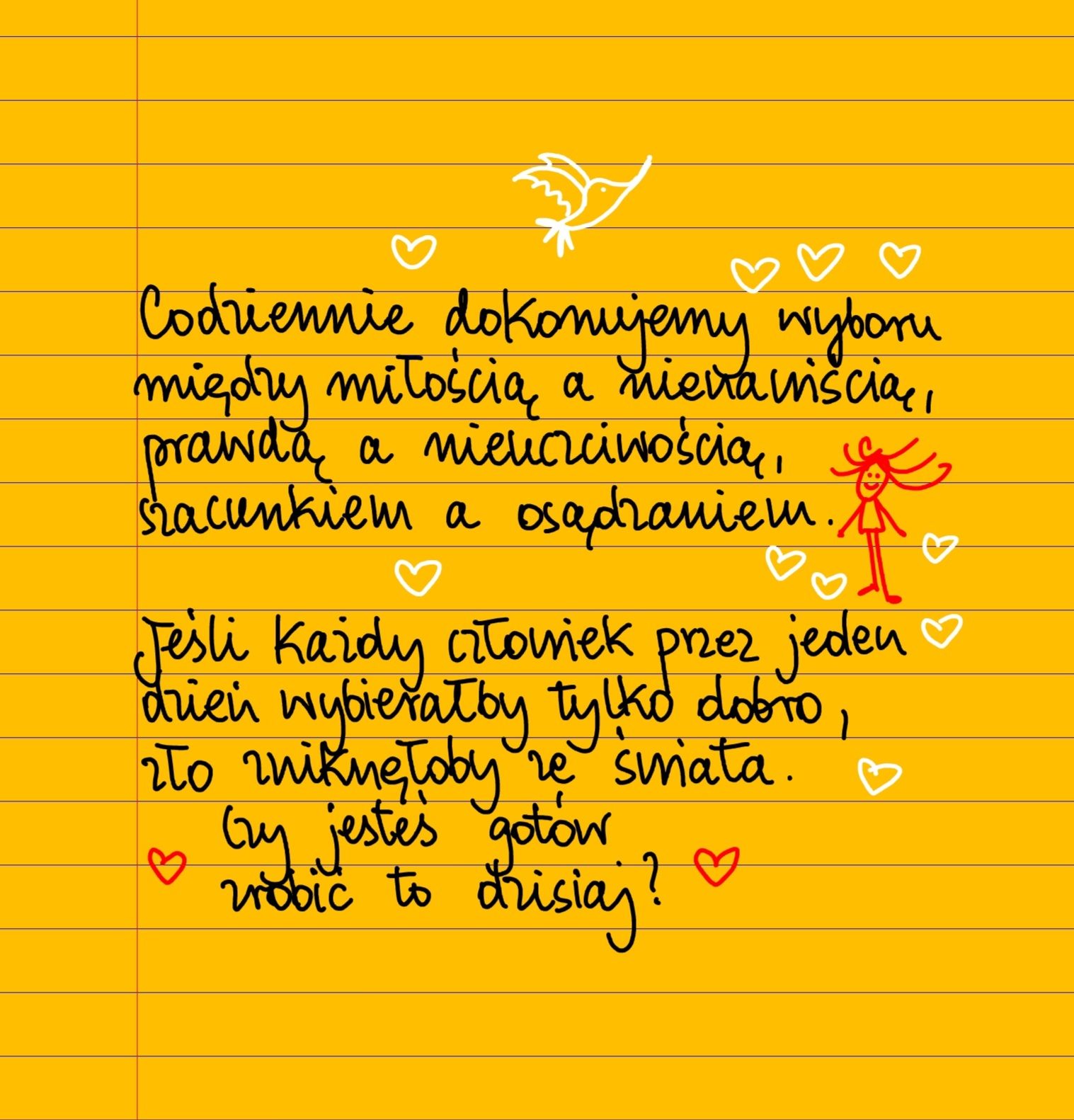 Codziennie przy wielu drobnych okazjach dokonujemy wyboru między miłością a nienawiścią, między prawdą a nieuczciwością, między szacunkiem a osądzaniem. Jeśli każdy człowiek przez jeden dzień wybierałby tylko dobro, zło zniknęłoby ze świata. Czy jesteś gotów podjąć się takiego zadania na jeden cały dzień? Dzisiaj od rana? Każde wielkie dobro i przemiana całego świata zaczyna się od Ciebie ❤