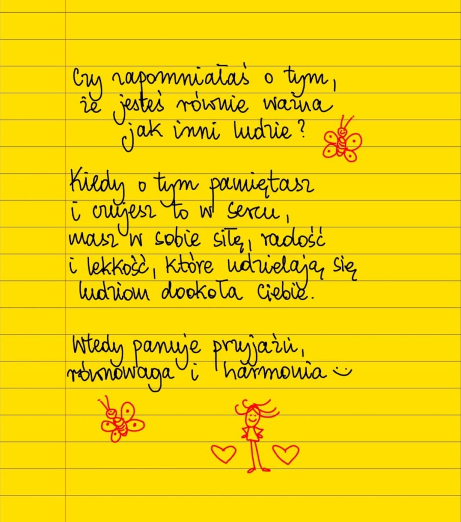 Czy zapomniałaś o tym, że jesteś równie ważna jak inni ludzie? Kiedy o tym pamiętasz i czujesz to w sercu, masz w sobie siłę, radość i lekkość, które udzielają się ludziom dookoła Ciebie. Wtedy panuje przyjaźń, równowaga i harmonia. #żółtakartka