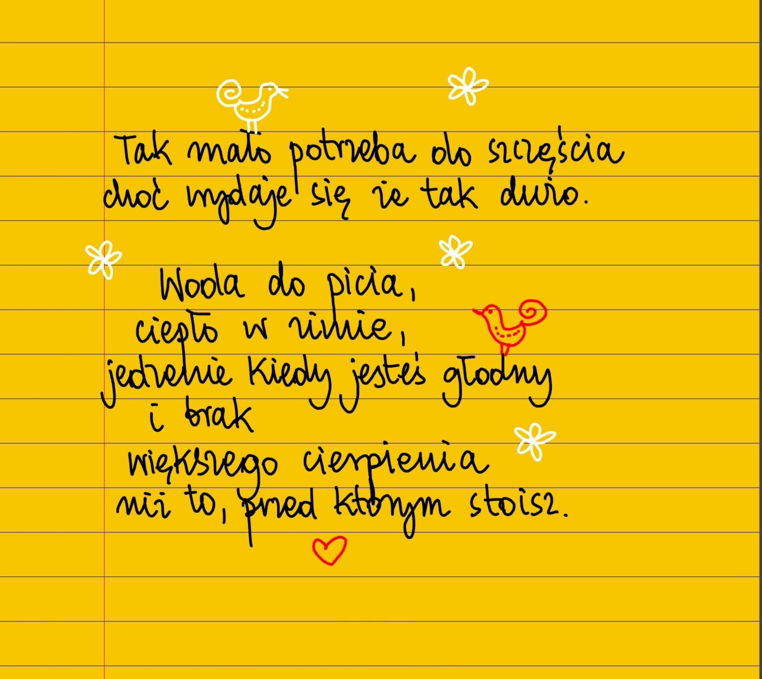 Żółte kartki Do szczęścia piątek, 09.02.2024 Tak mało potrzeba do szczęścia, choć wydaje się, że tak dużo. Woda do picia, ciepło w zimie, jedzenie kiedy jesteś głodny i brak wiekszego cierpienia niż to, przed którym stoisz. ❤ #żółtakartka Udostępnij na Facebooku