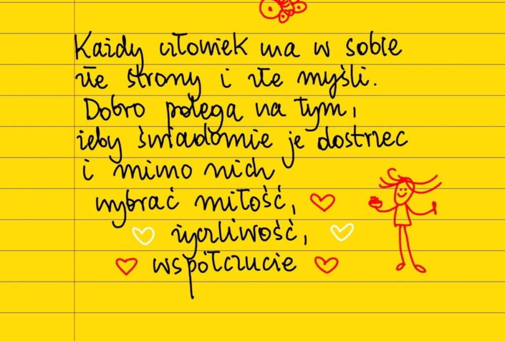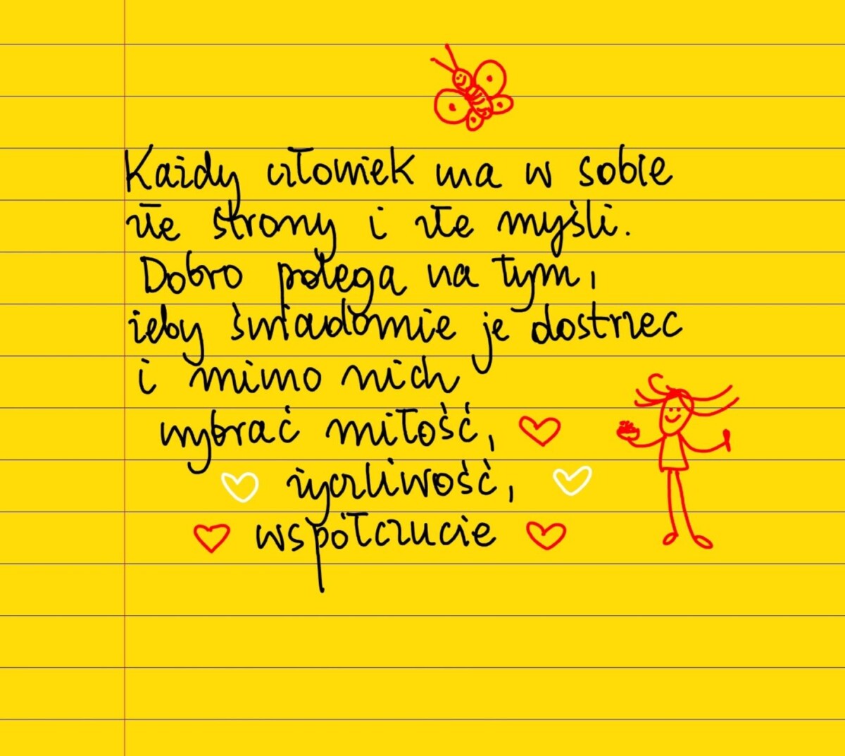 Żółte kartki Dobro i zło piątek, 30.07.2021 Każdy człowiek ma w sobie złe strony i złe mysli. Dobro polega na tym, żeby świadomie je dostrzec i mimo nich wybrać miłość, życzliwość, współczucie. #żółtakartka Udostępnij na Facebooku
