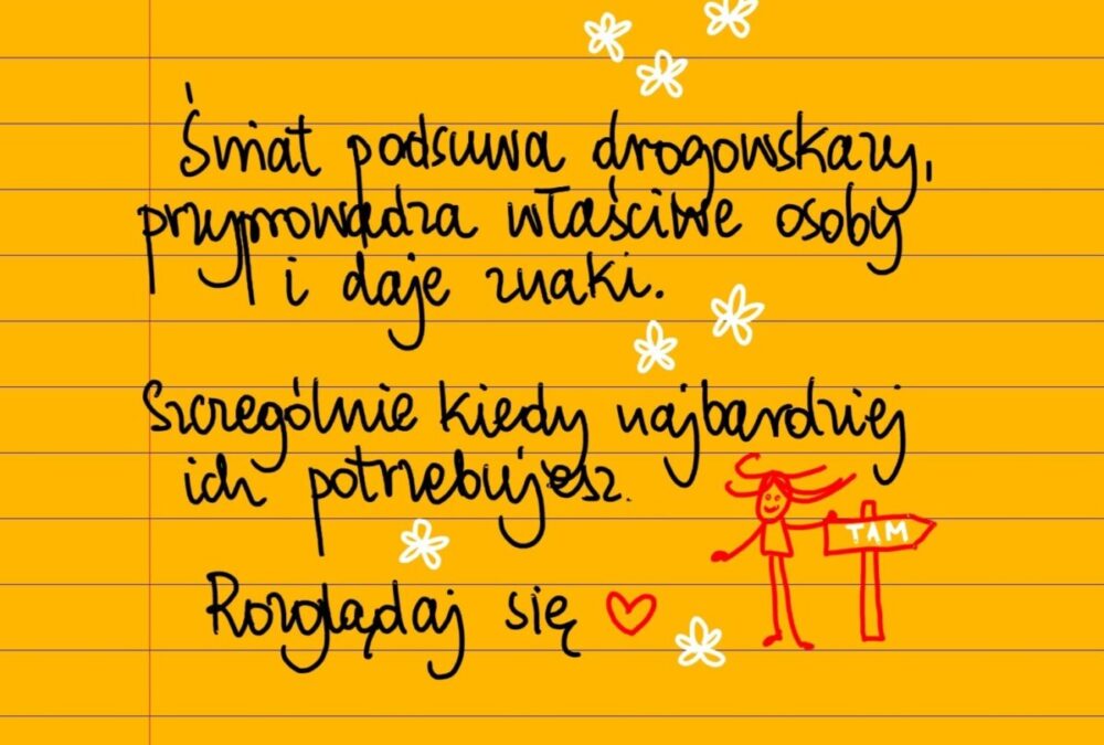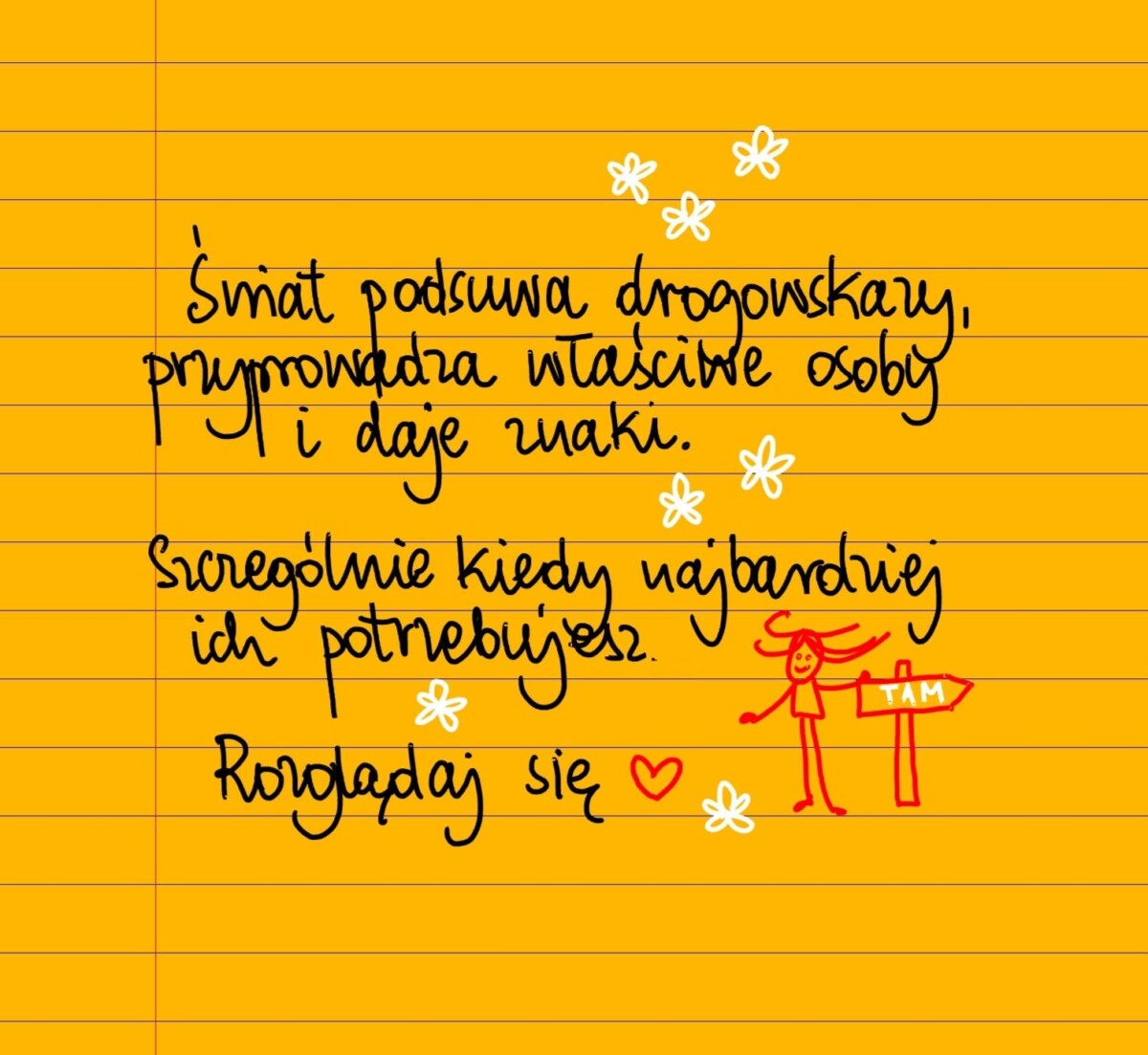 Żółte kartki Drogowskazy środa, 15.03.2023 Świat podsuwa drogowskazy, przyprowadza właściwe osoby i daje znaki. Szczególnie kiedy najbardziej ich potrzebujesz. Rozglądaj się 😊 #żółtakartka Udostępnij na Facebooku