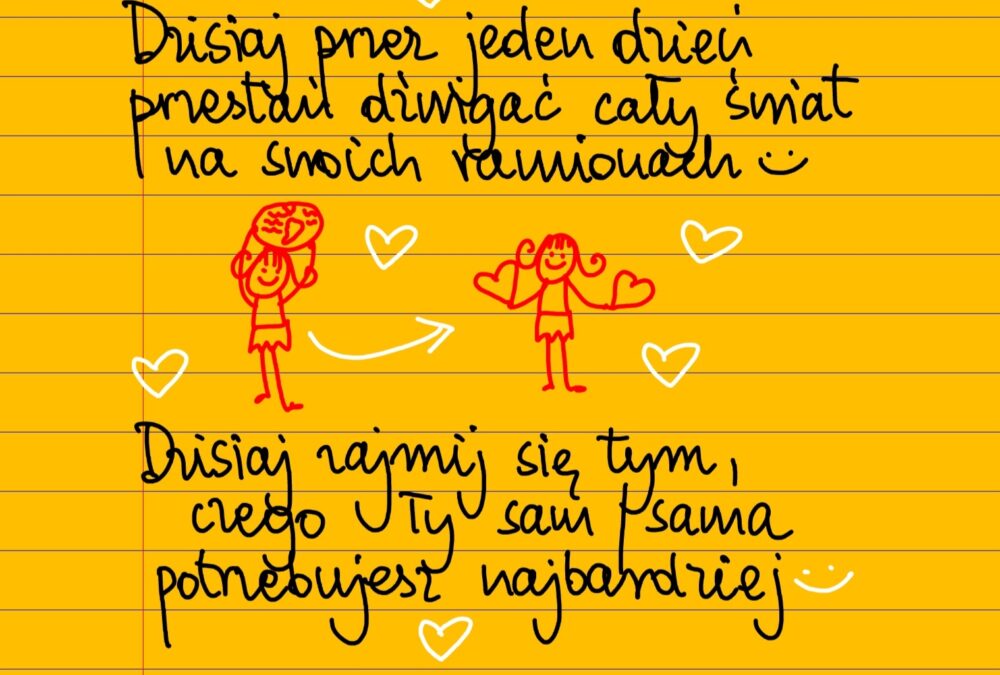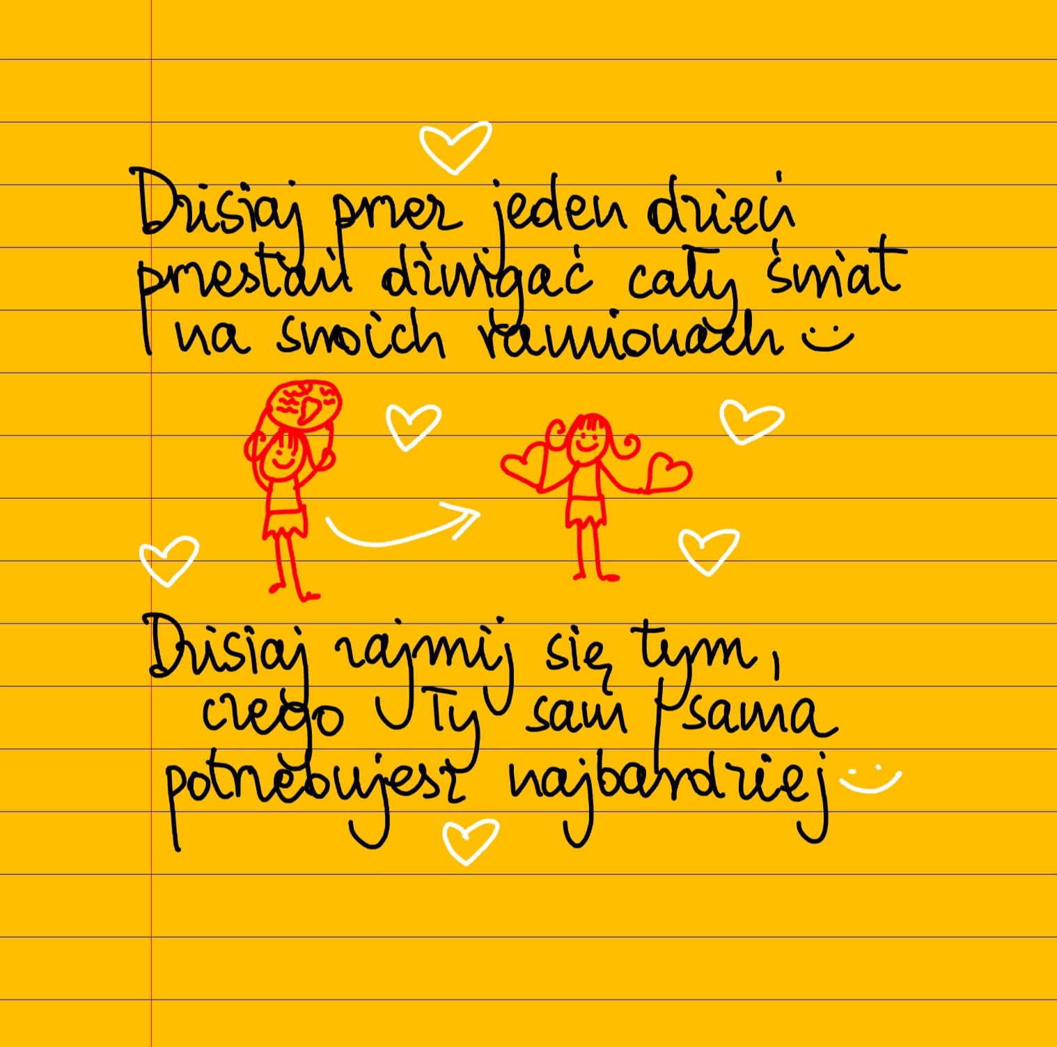 Dzisiaj przez jeden dzień przestań dźwigać cały świat na swoich ramionach. Dzisiaj zajmij się tylko tym, czego ty sam/sama potrzebujesz najbardziej. #żółtakartka