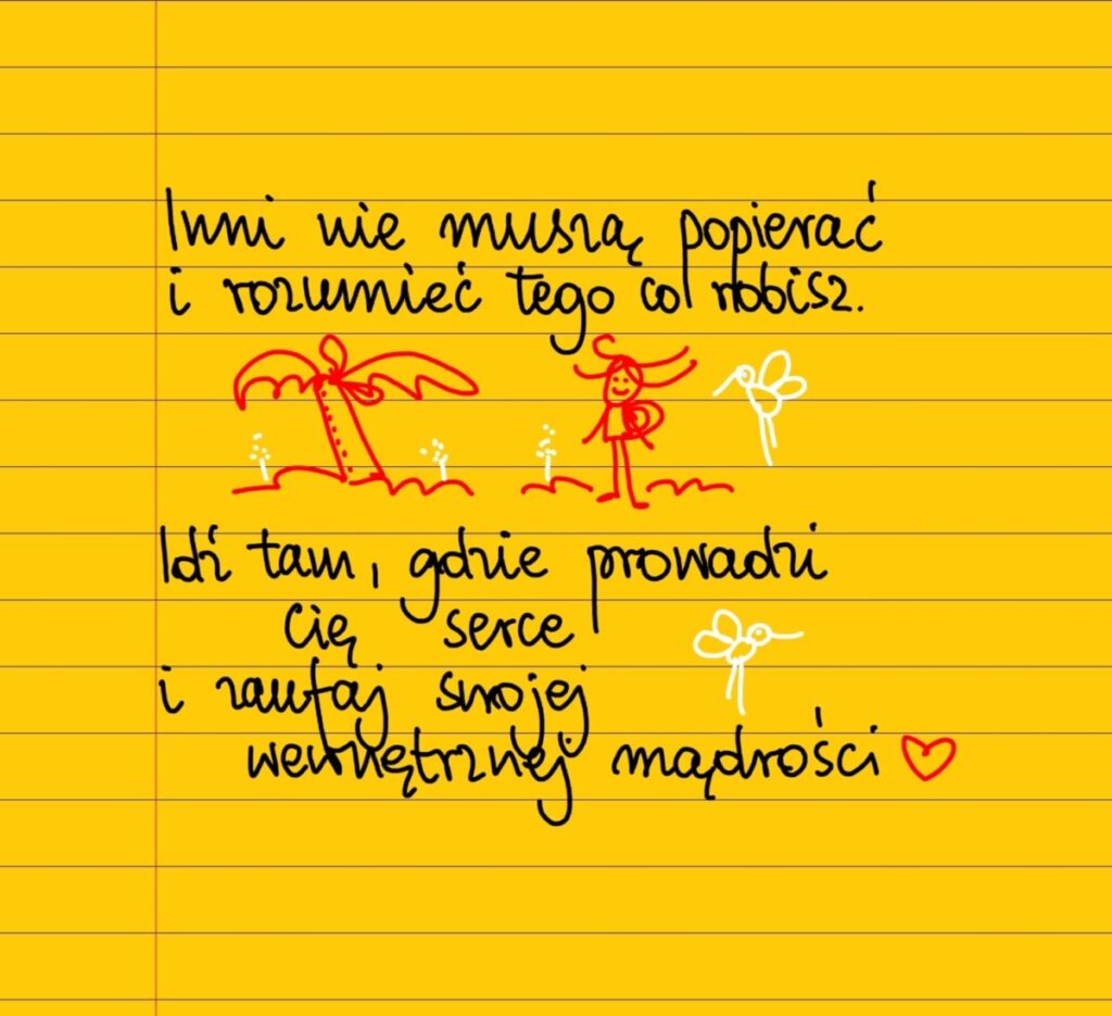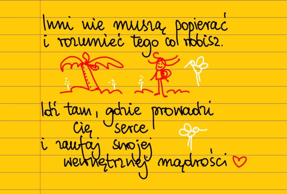 Żółte kartki Idź za swoim sercem wtorek, 16.08.2022 Inni nie muszą rozumieć i popierać tego co robisz. Idź tam, gdzie prowadzi cię serce i zaufaj swojej wewnętrznej mądrości. #takartka Udostępnij na Facebooku