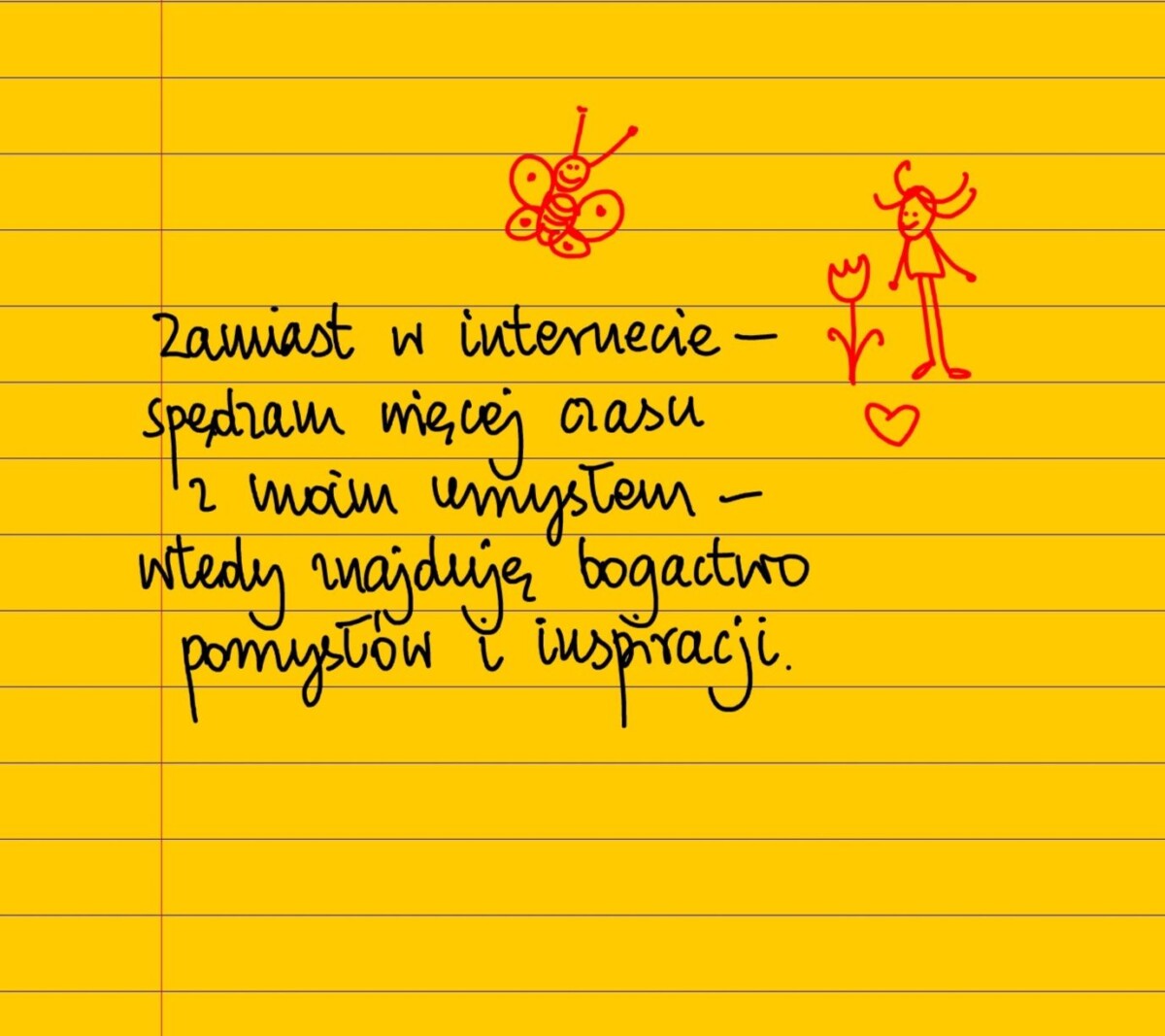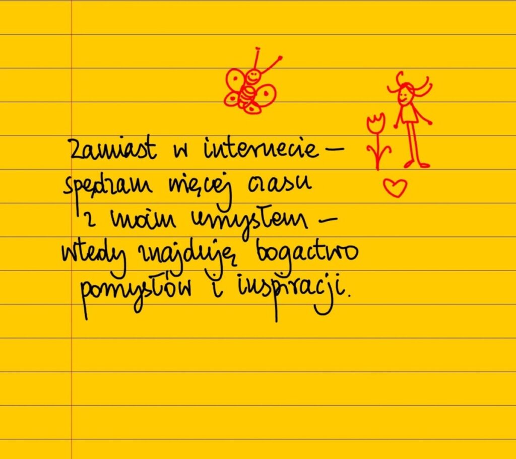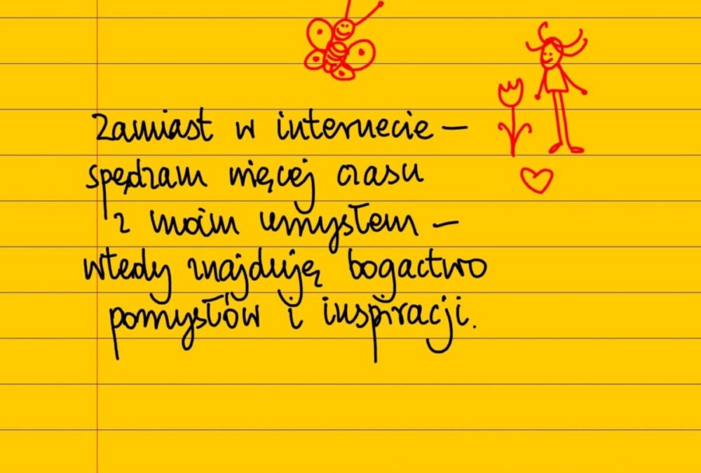Żółte kartki Inspiracja i pomysły piątek, 30.04.2021 Zamiast w internecie spędzam więcej czasu z moim umysłem – wtedy znajduję w nim bogactwo inspiracji, pomysłów i rozwiązań. #żółtakartka Udostępnij na Facebooku