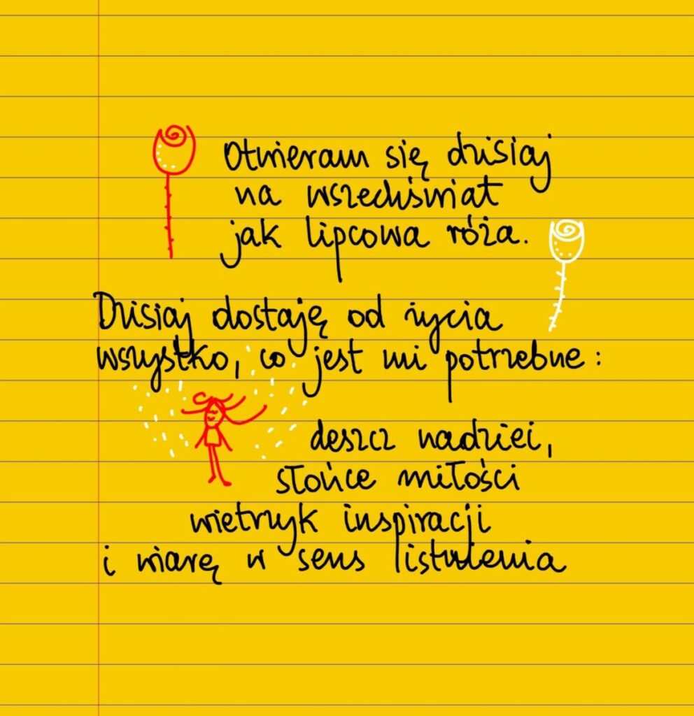 Otwieram się dzisiaj na wszechświat jak lipcowa róża. Dzisiaj dostaję od życia wszystko, co jest mi potrzebne do dalszej drogi: deszcz nadziei, słońce miłości, wietrzyk inspiracji i głęboką wiarę w sens mojego istnienia. #żółtakartka