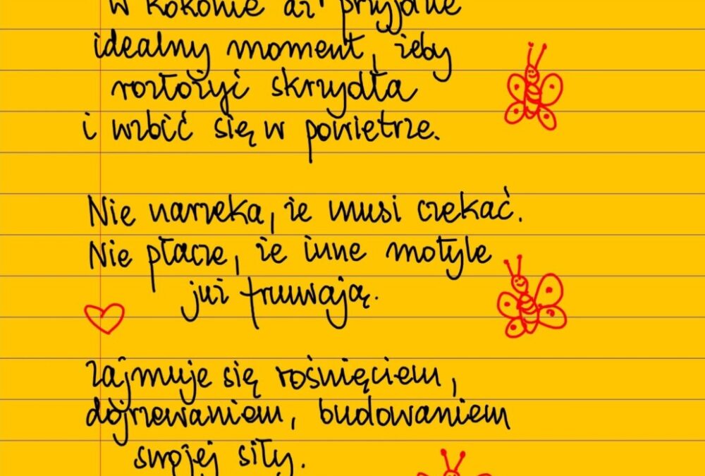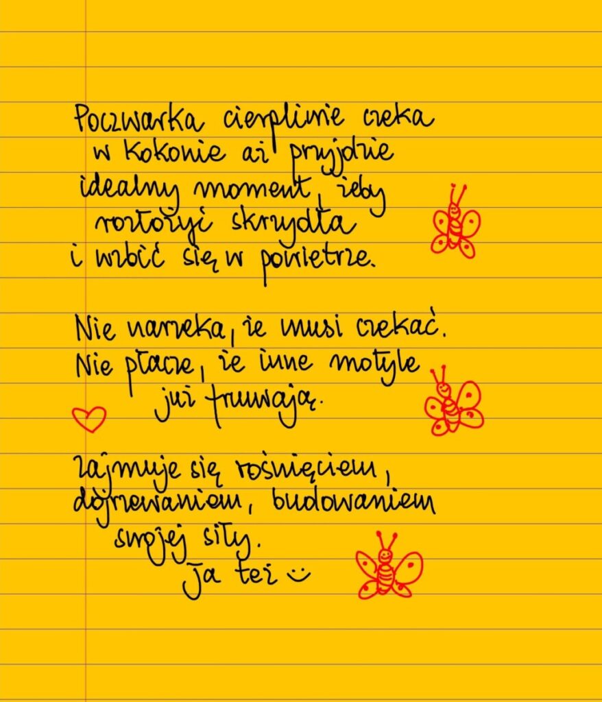 Poczwarka cierpliwie czeka w kokonie aż przyjdzie idealny moment, żeby rozłożyć skrzydła i wzbić się w powietrze. Nie narzeka, że musi czekać. Nie płacze, że inne motyle już fruwają. Zajmuje się rośnięciem, dojrzewaniem, budowaniem swojej siły. Ja też. #żółtakartka