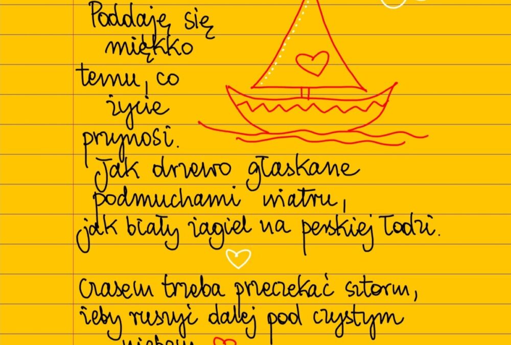 Poddaję się miękko temu, co przynosi życie. Jak drzewo głaskane wiatrem, jak żagiel na perskiej łodzi. Czasem trzeba przeczekać sztorm, żeby ruszyć dalej pod czystym niebem. #żółtakartka
