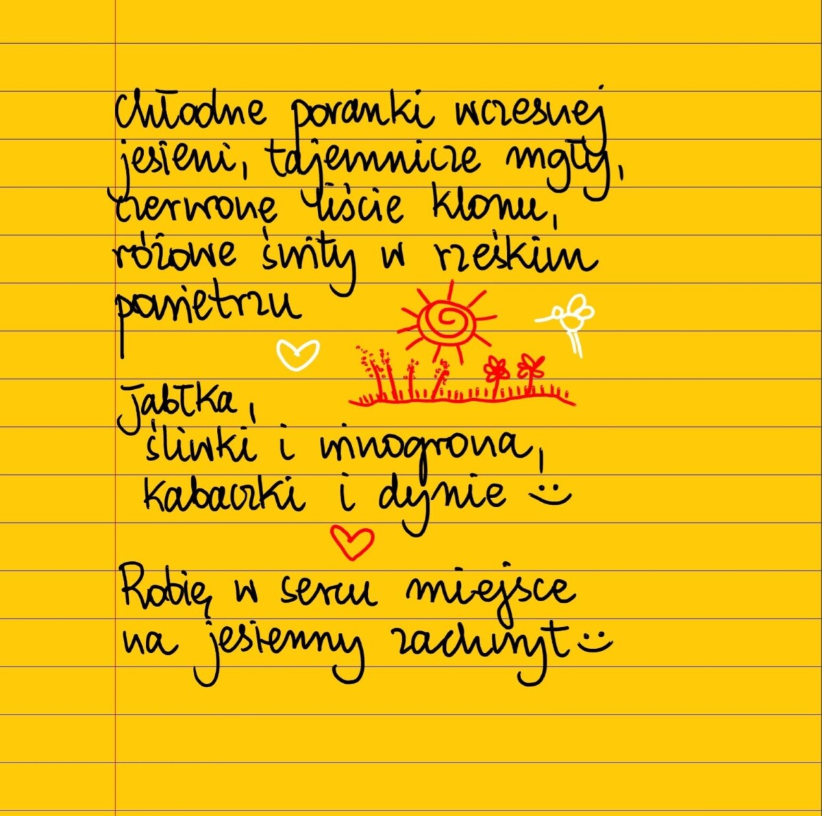 Żółte kartki Jesienny zachwyt czwartek, 29.09.2022 Chłodne poranki wczesnej jesieni, tajemnicze mgły, czerwone liście klonu, różowe świty w rześkim powietrzu. Jabłka, śliwki i winogrona, kabaczki, dynie i papryka. Dziękuję, jestem wdzięczna, robię w sercu miejsce na jesienny zachwyt. #żółtakartka Udostępnij na Facebooku