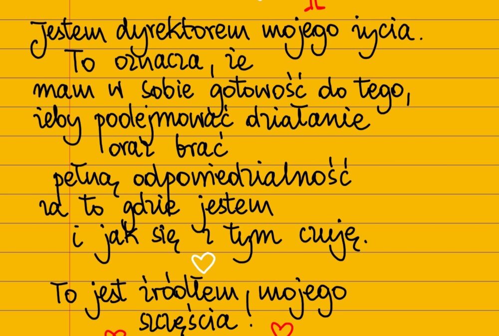 Żółte kartki Jestem dyrektorem mojego życia wtorek, 16.01.2024 Jestem dyrektorem mojego życia. To oznacza, że mam w sobie gotowość do tego, żeby podejmować działanie i brać pełną odpowiedzialność za to gdzie jestem i jak się z tym czuję. To jest źródłem mojego szczęścia ❤ #żółtakartka Udostępnij na Facebooku