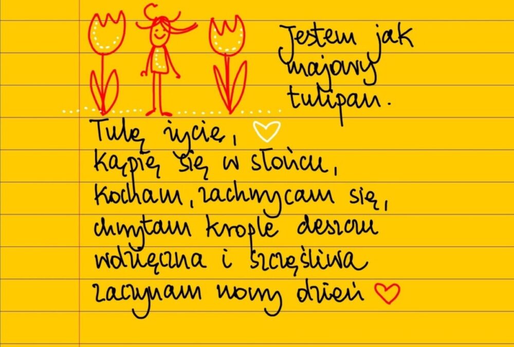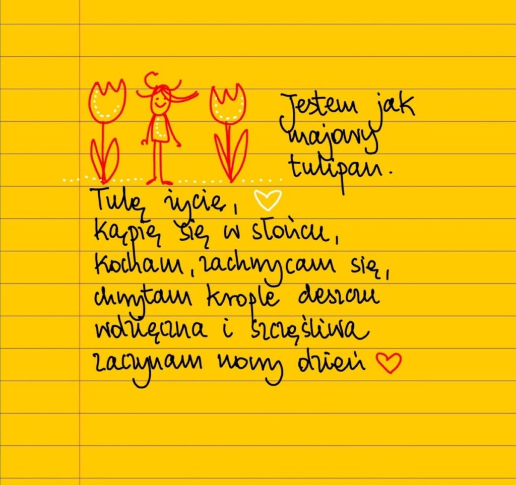 Żółte kartki Jestem jak majowy tulipan poniedziałek, 24.05.2021 Jestem jak majowy tulipan. Tulę życie, kąpię się w słoń, kocham, zachwycam się, chwytam krople deszczu, wdzięczna i szczęśliwa zaczynam nowy dzień. #żółtakartka Udostępnij na Facebooku