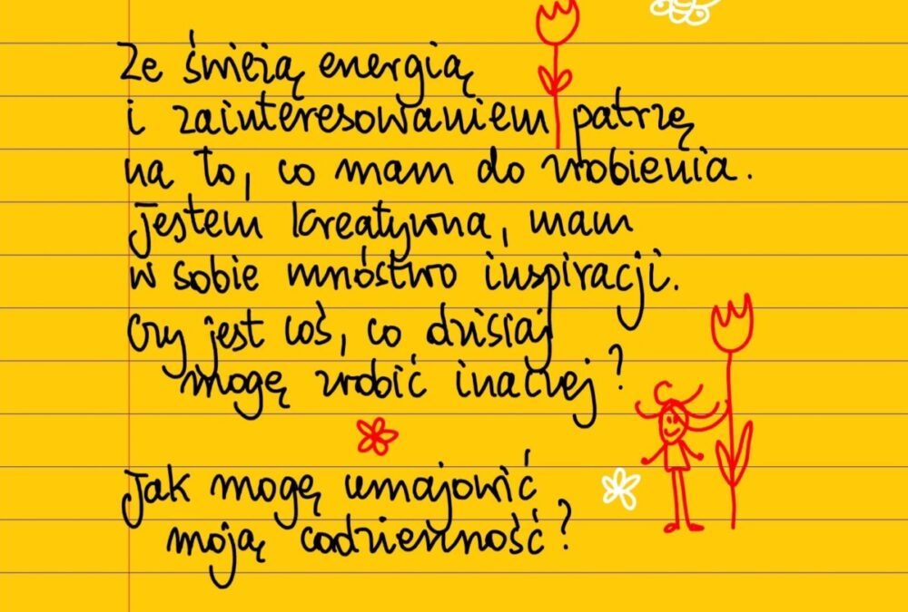 Ze świeżą energią i zainteresowaniem patrzę na to, co mam do zrobienia. Jestem kreatywna, mam w sobie mnóstwo inspiracji. Czy jest coś, co dzisiaj mogę zrobić inaczej? Jak mogłabym umajowić moją codzienność? #żółtakartka