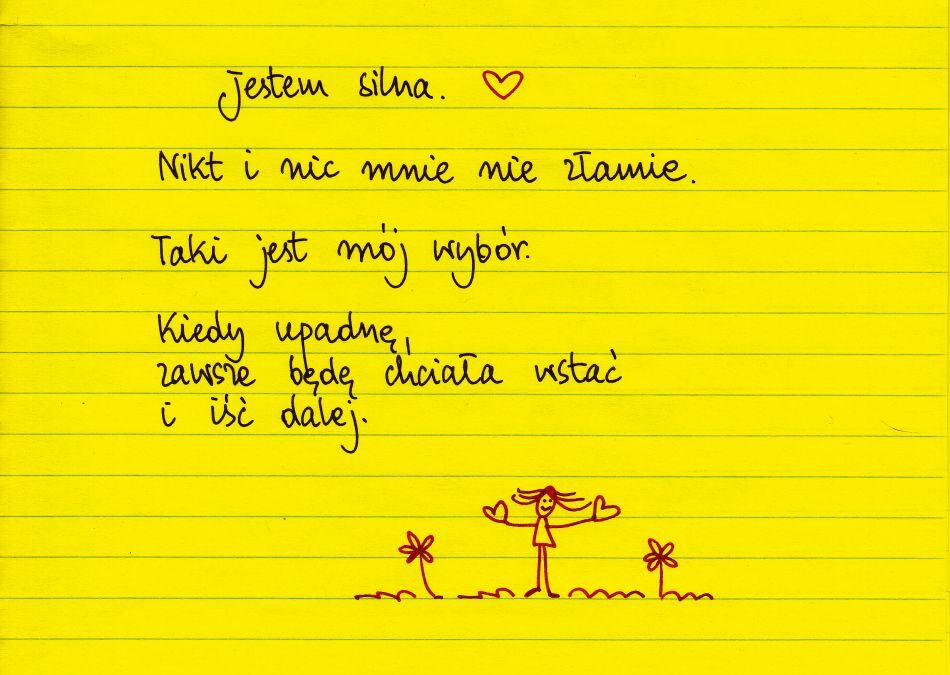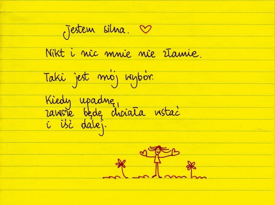 Żółte kartki Jestem silna środa, 20.11.2024 Jestem silna. Nikt i nic mnie nie złąmie. Taki jest mój wybór. Kiedy upadnę, zawsze będę chciała wstać i iść dalej ❤ Udostępnij na Facebooku