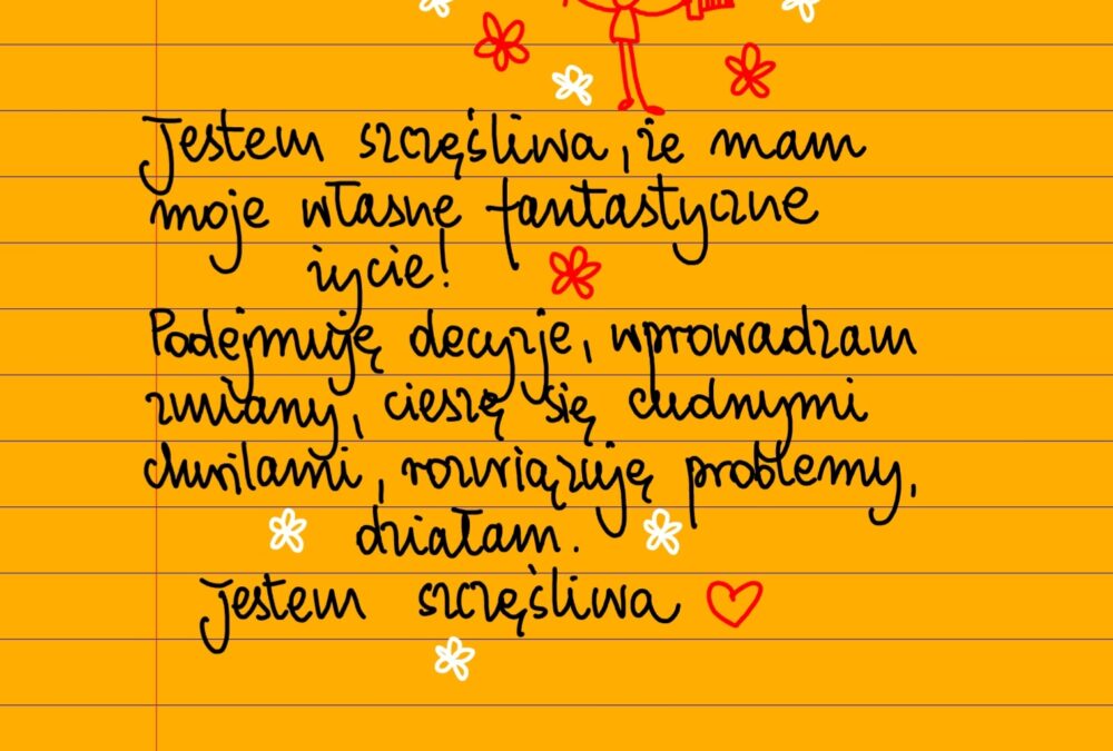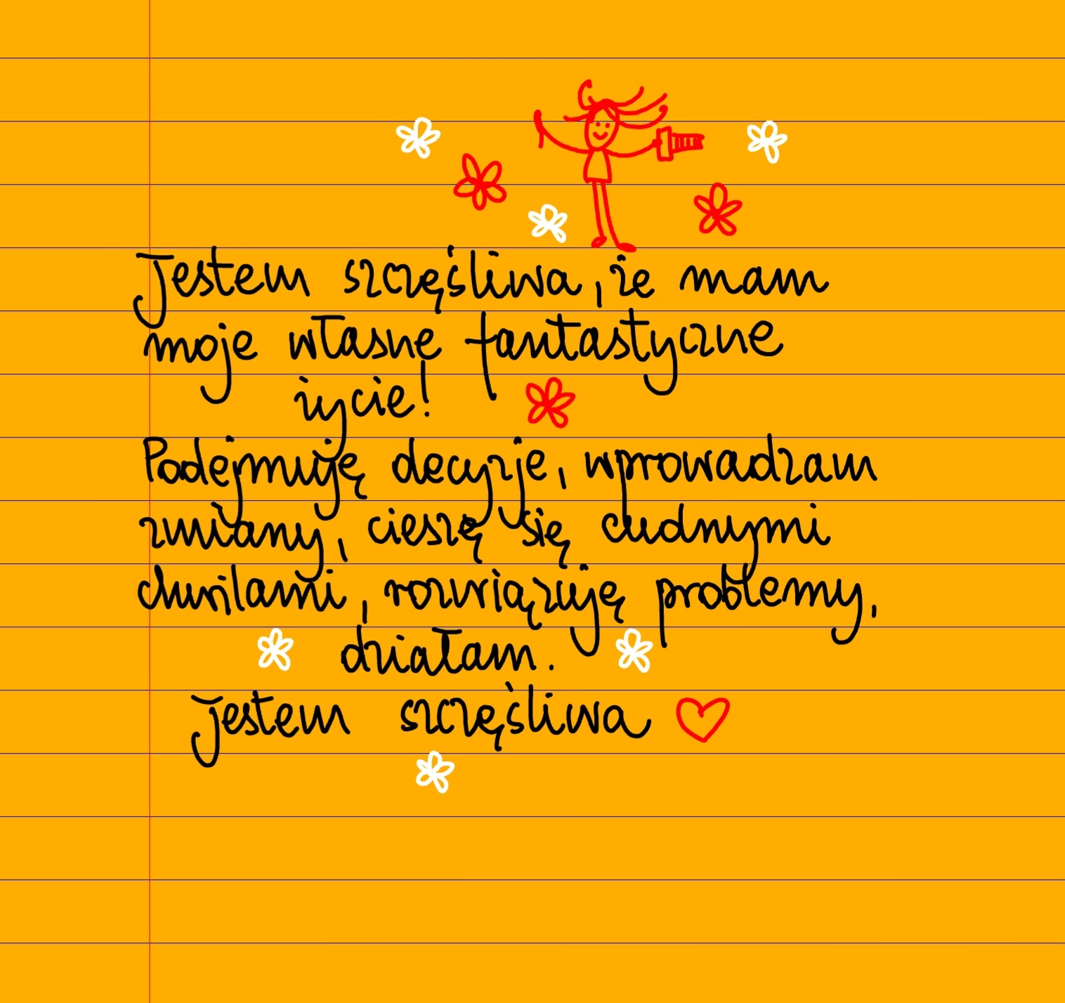 Żółte kartki Jestem szczęśliwa środa, 29.01.2025 Jestem szczęśliwa, że mam moje własne fantastyczne życie! Podejmuję decyzje, wprowadzam zmiany, cieszę się cudnymi chwilami, rozwiązuję problemy, działam. Jestem szczęśliwa ❤ Udostępnij na Facebooku