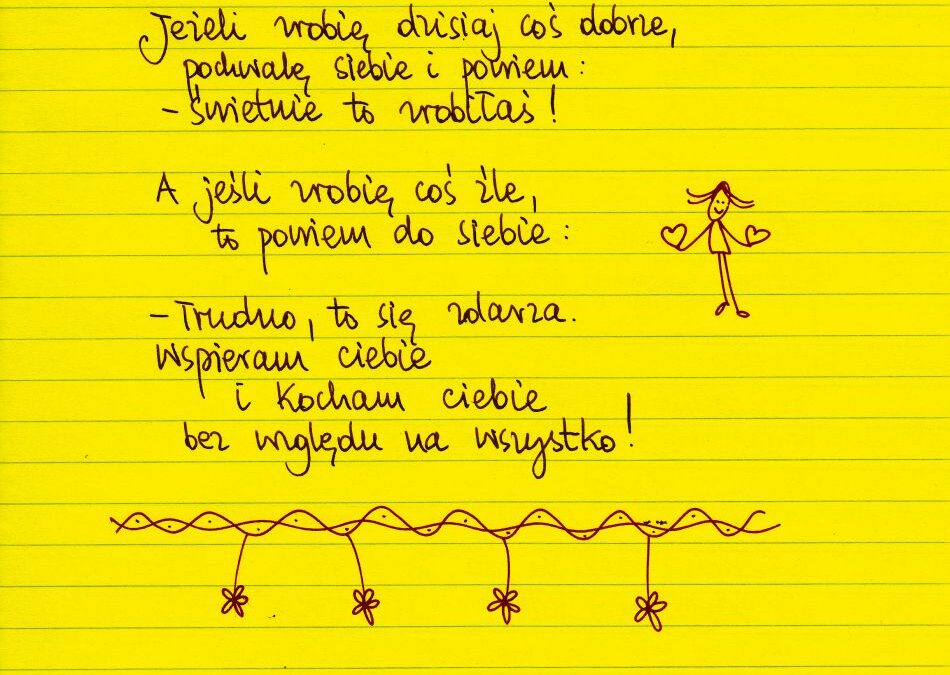 Jeżeli zrobię dzisiaj coś dobrze, pochwalę siebie i powiem: „Świetnie to zrobiłaś!” A jeśli zrobię coś źle, to powiem do siebie: „Trudno, to się zdarza. Wspieram ciebie i kocham ciebie bez względu na wszystko!” ❤