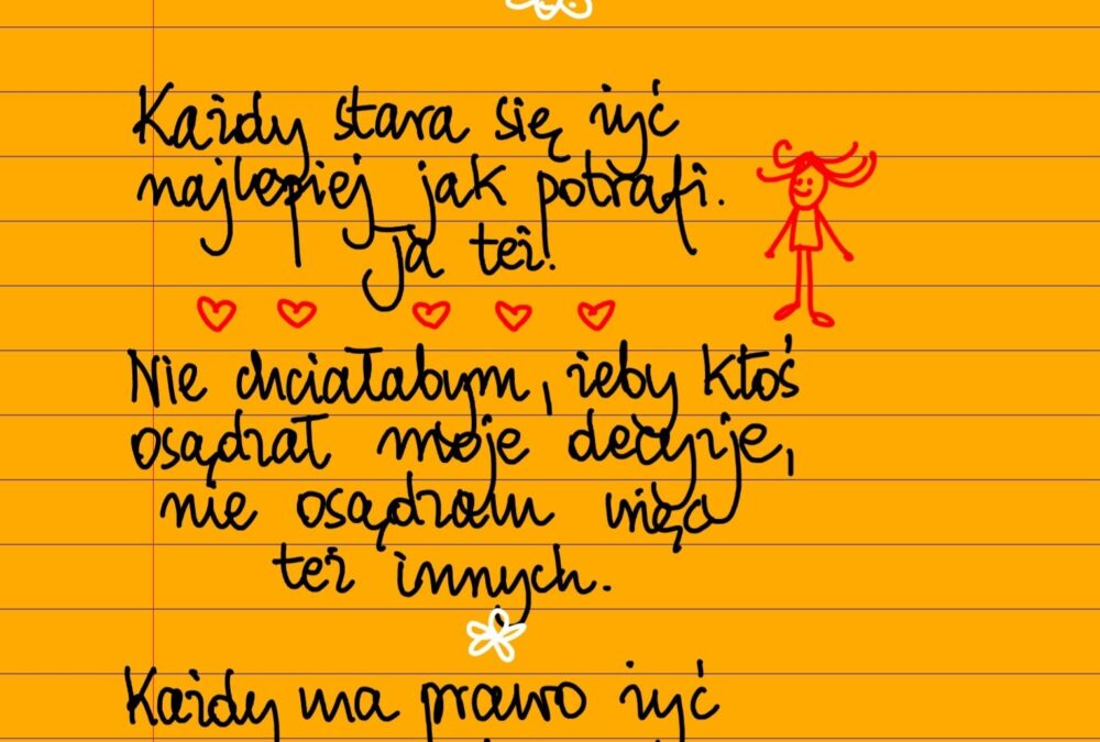 Żółte kartki Każdy ma prawo żyć jak chce piątek, 21.04.2023 Każdy stara się żyć najlepiej jak potrafi, ja też. Nie chciałabym, żeby ktoś osądzał moje decyzje i działanie, nie robię tego też wobec innych. Każdy ma prawo żyć po swojemu. #żółtakartka Udostępnij na Facebooku