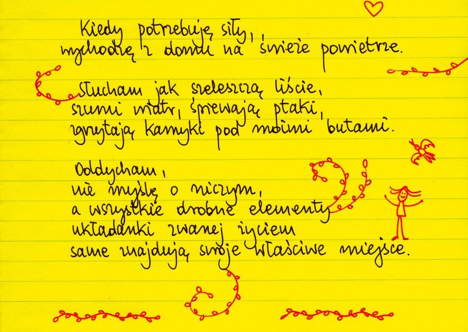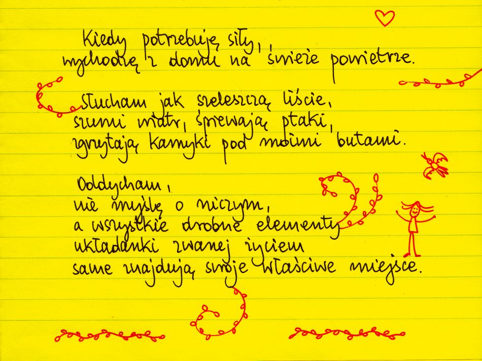 Kiedy potrzebuję siły, wychodzę z domu na świeże powietrze. Słucham jak szeleszczą liście, szumi wiatr, śpiewaja ptaki, zgrzytaja kamyki pod moimi butami. Oddycham, nie myślę o niczym, a wszystkie drobne elementy układanki zwanej życiem same znajdują swoje właściwe miejsce. #żółtakartka