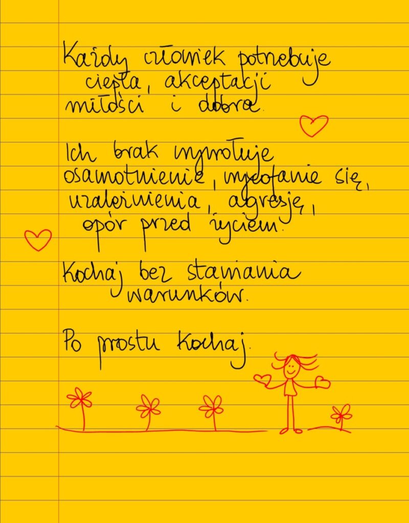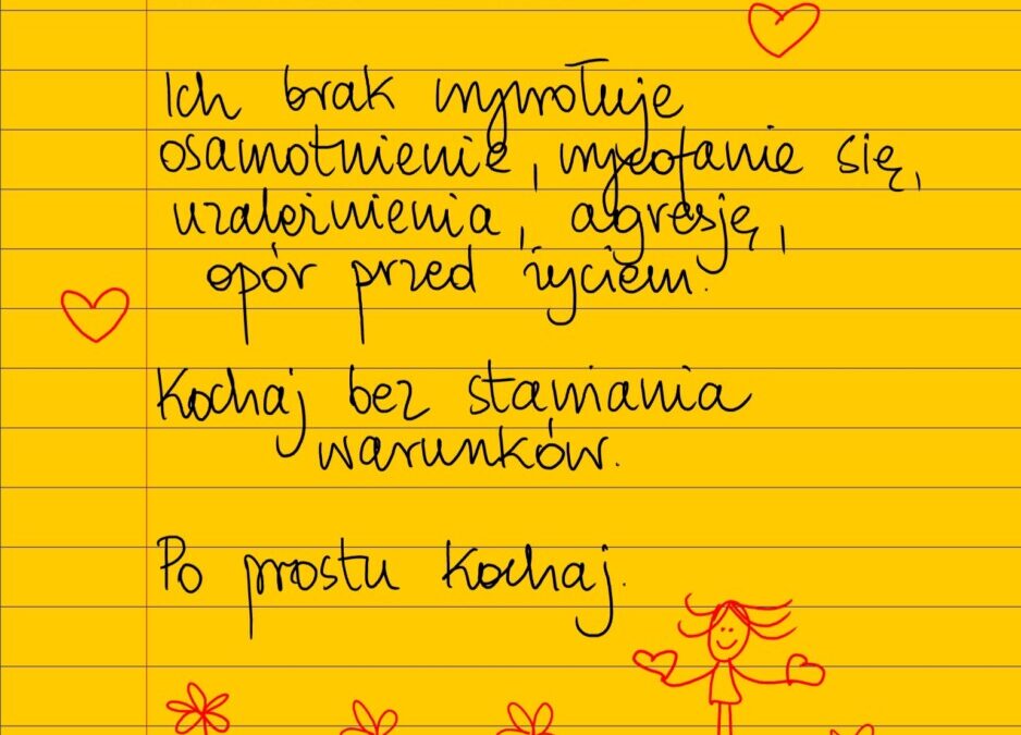 Żółte kartki Kochaj bez stawiania warunków czwartek, 11.11.2021 Każdy człowiek potrzebuje ciepła, akceptacji, milości i dobra. Ich brak wywołuje osamotnienie, wycofanie się, agresję, uzależnienia, opór przed życiem. Kochaj bez stawiania warunków. Po prostu kochaj. #żółtakartka Udostępnij na Facebooku