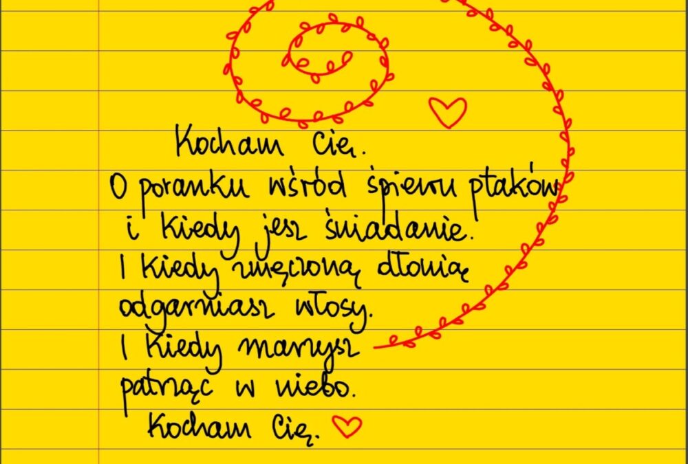 Kocham Cię. O poranku wśród śpiewu ptaków i kiedy jesz śniadanie. I kiedy zmęczoną dłonią odgarniasz włosy. I kiedy marzysz patrząc w niebo. Kocham cię. #żółtakartka