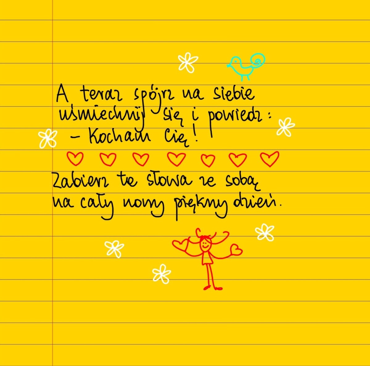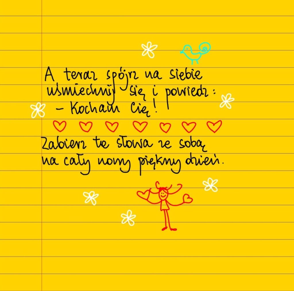 Żółte kartki Kocham cię piątek, 28.05.2021 A teraz spójrz na siebie, uśmiechnij się i powiedz: – Kocham Cię! Zabierz tego słowa na cały nowy, piękny dzień ❤️ #żółtakartka Udostępnij na Facebooku