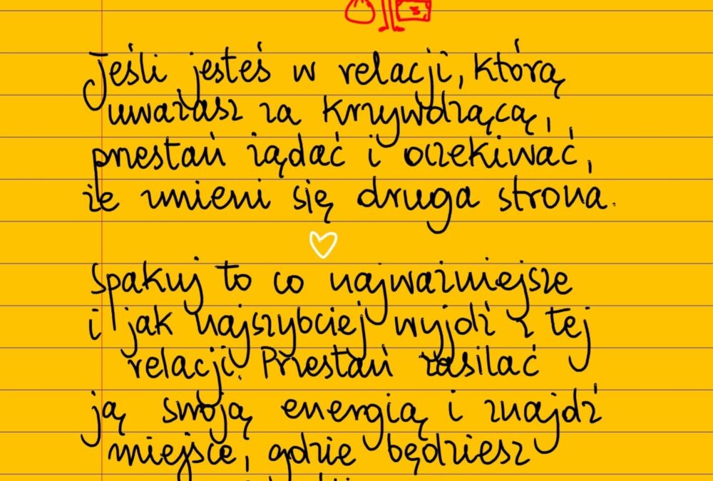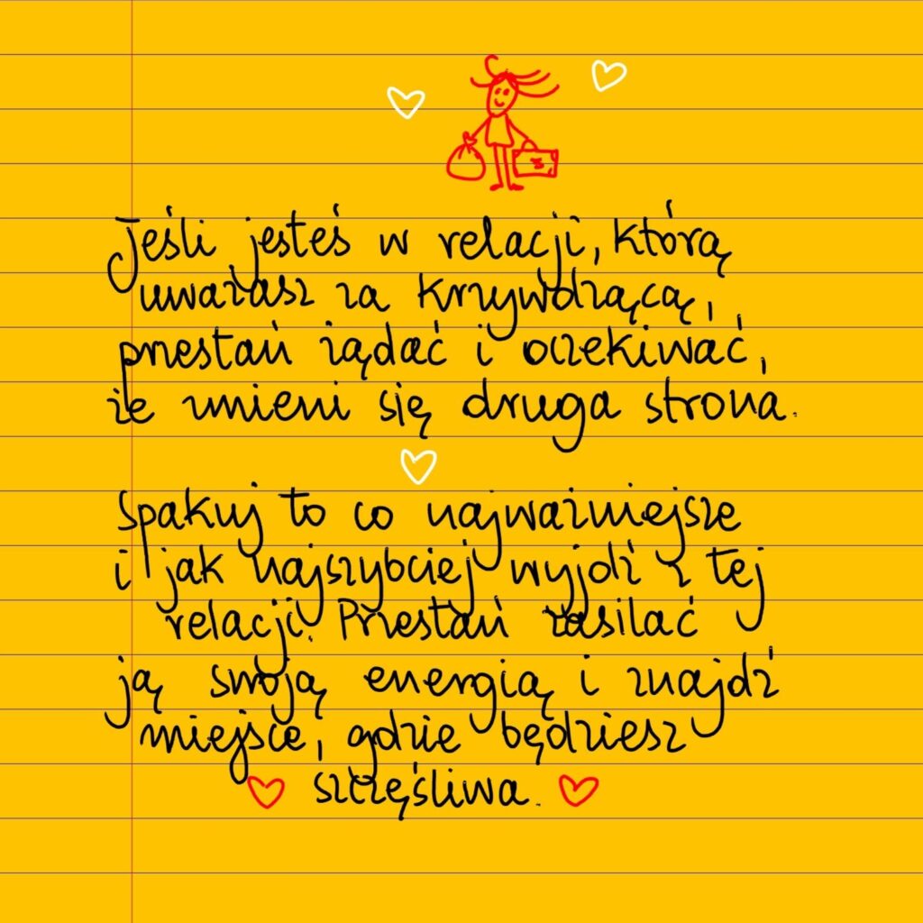 Jeśli jesteś w relacji, którą uważasz za krzywdzącą dla siebie, przestań żądać i oczekiwać, że zmieni się druga strona. Spakuj to co najważniejsze i jak najszybciej wyjdź z tej relacji, przestań zasilać ją swoją energią i znajdź takie miejsce, gdzie będziesz szczęśliwa ❤