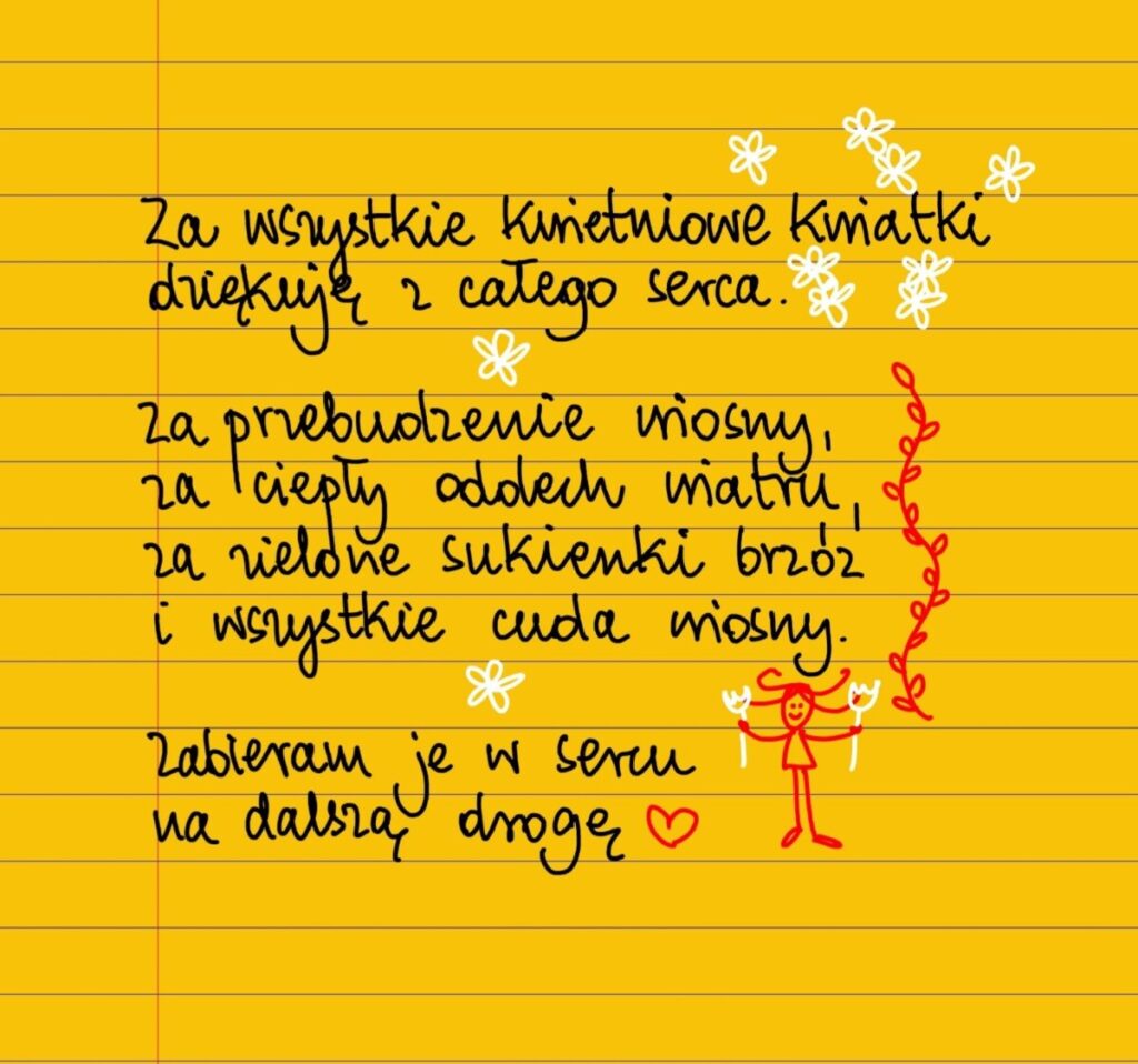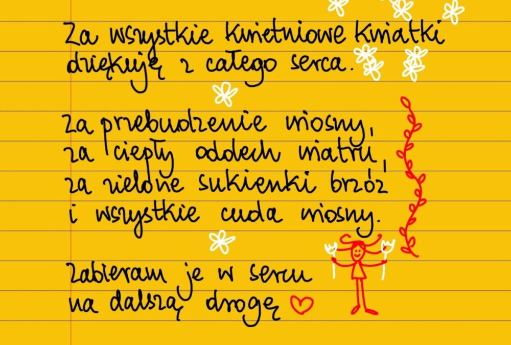 Żółte kartki Kwietniowe dziękuję piątek, 29.04.2022 Za wszystkie kwietniowe kwiatki dziękuję z całego serca. Za przebudzenie wiosny, za ciepły oddech wiatru, za zielone sukienki brzóz i wszystkie cuda wiosny. Zabieram je w sercu na dalszą drogę. Dziękuję ❤❤❤ #żółtakartka Udostępnij na Facebooku