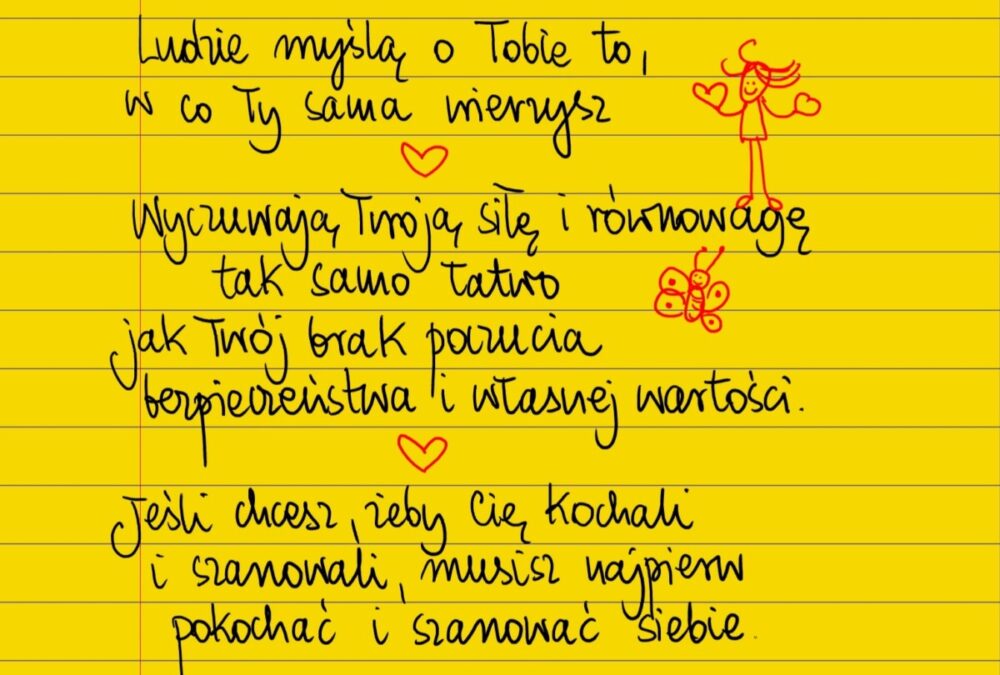Ludzie myślą o Tobie to, w co Ty sama wierzysz. Wyczuwają Twoją siłę i równowagę tak samo łatwo jak Twój brak poczucia bezpieczeństwa i własnej wartości. Jeśli chcesz, żeby Cię kochali i szanowali, musisz najpierw pokochać i szanować siebie. #żółtakartka