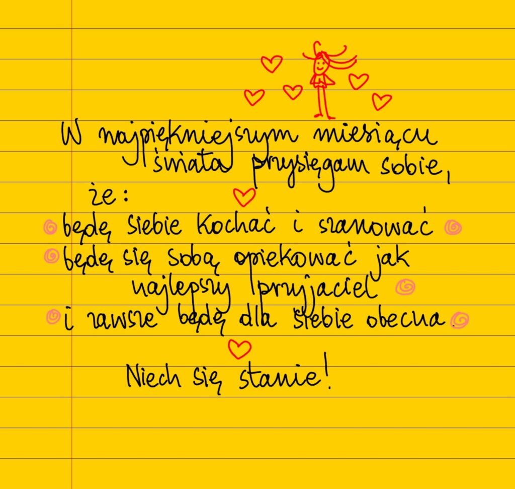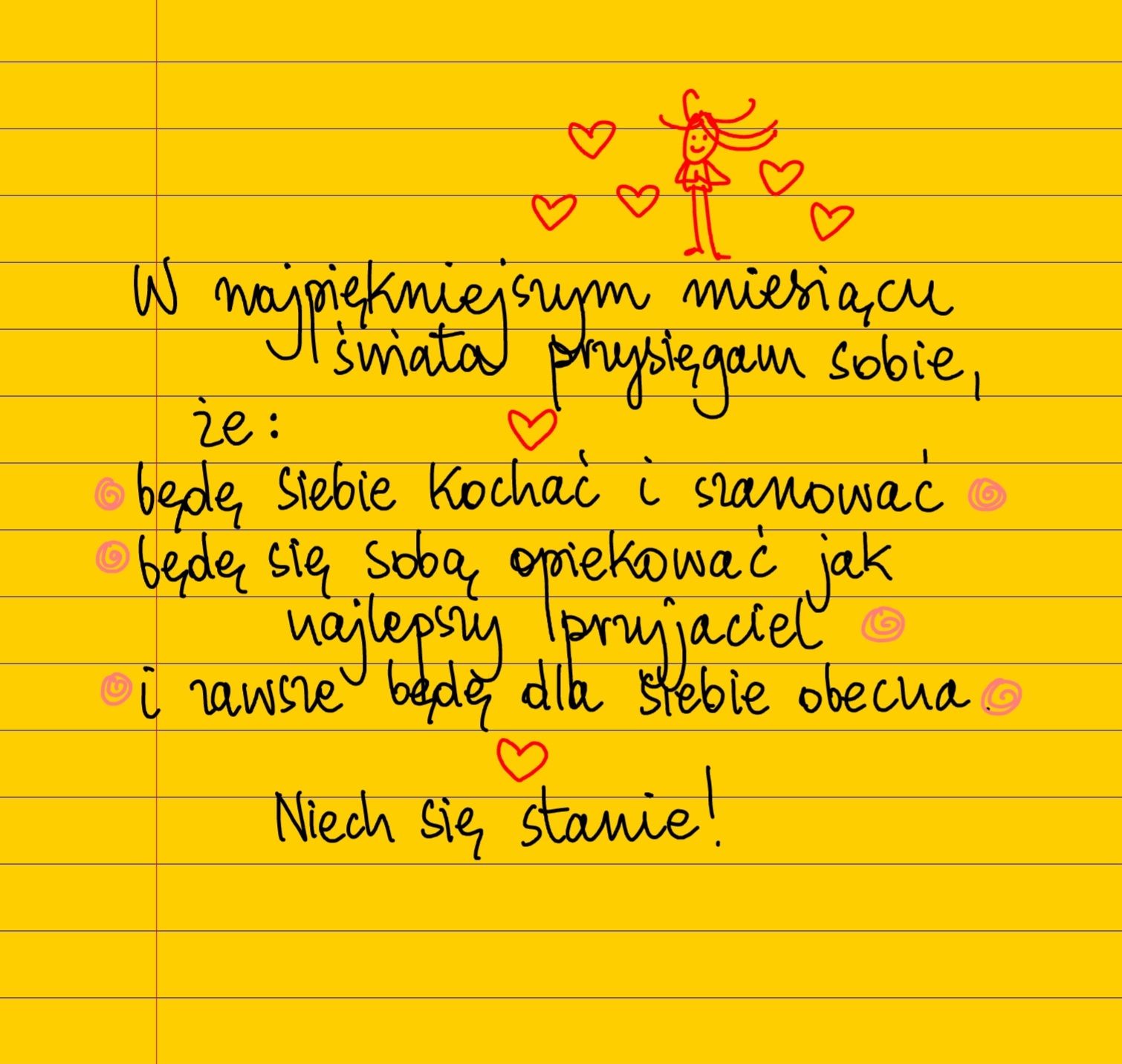 Żółte kartki Majowa przysięga środa, 01.05.2024 W najpiękniejszym miesiącu świata przysięgam sobie, że będę się kochać i szanować, będę się sobą opiekować jak najlepszy przyjaciel, i zawsze będę dla siebie obecna. Niech tak się stanie! ❤ Udostępnij na Facebooku