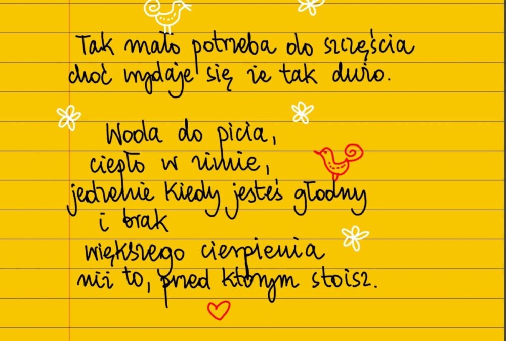 Żółte kartki Mało potrzeba do szczęścia środa, 10.09.2025 Tak mało potrzeba do szczęścia choć wydaje się, że tak dużo. Woda do picia, ciepło w zimie, jedzenie kiedy jesteś głodny i brak większego cierpienia niż to, przed którym stoisz. #żółtakartka Udostępnij na Facebooku