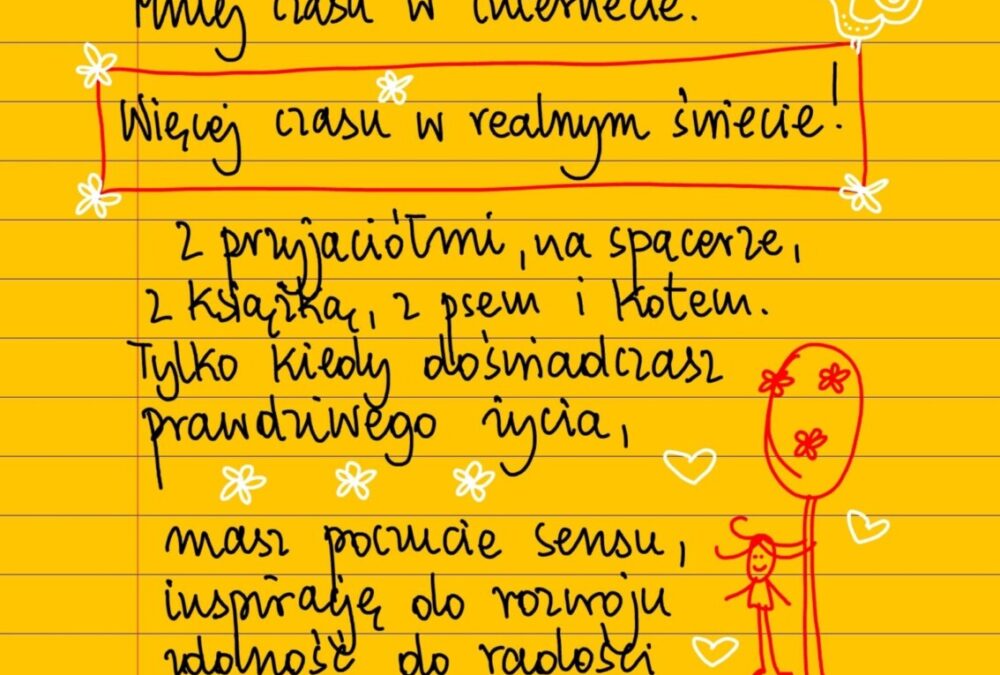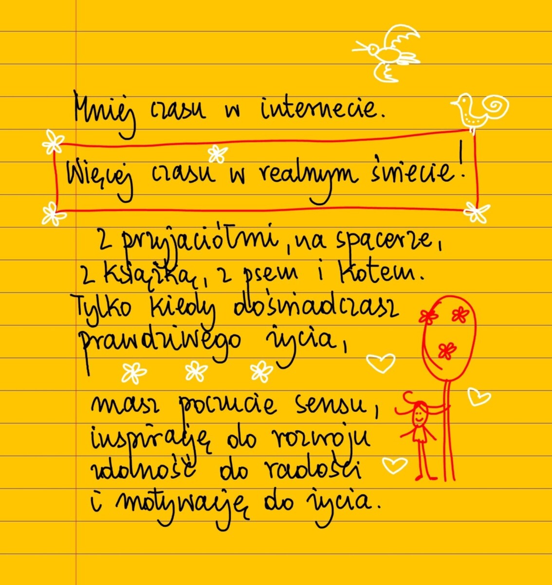 Mniej czasu w internecie. Więcej czasu w realnym świecie! Z przyjaciółmi, na spacerze, z książką, z psem i kotem. Tylko kiedy doświadczasz prawdziwego życia, masz poczucie sensu, inspirację do rozwoju, zdolność do radości i motywację do życia. #żółtakartka