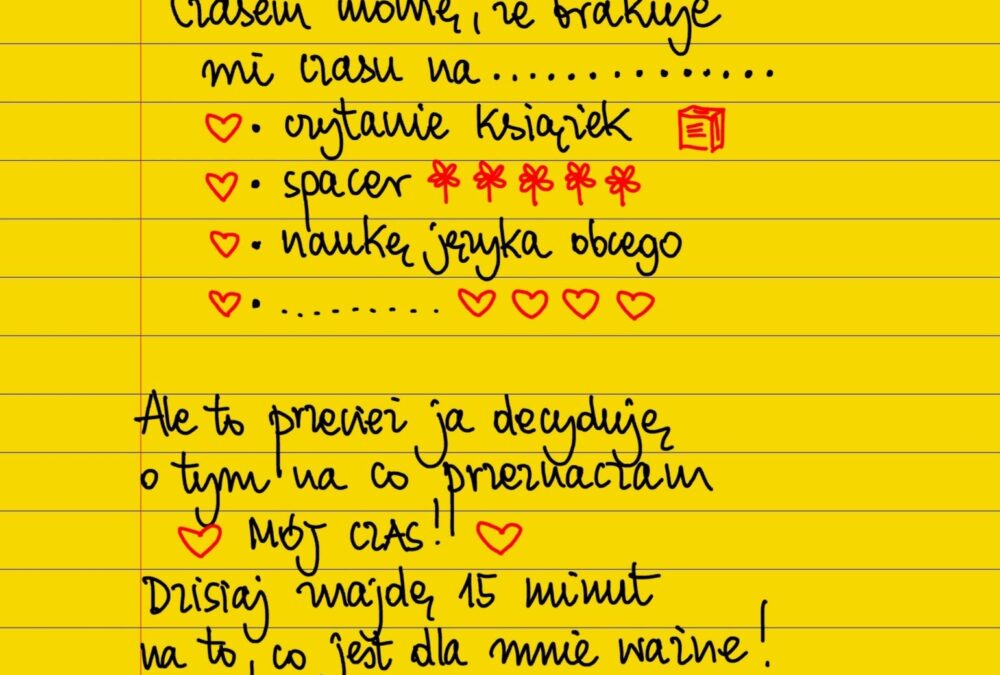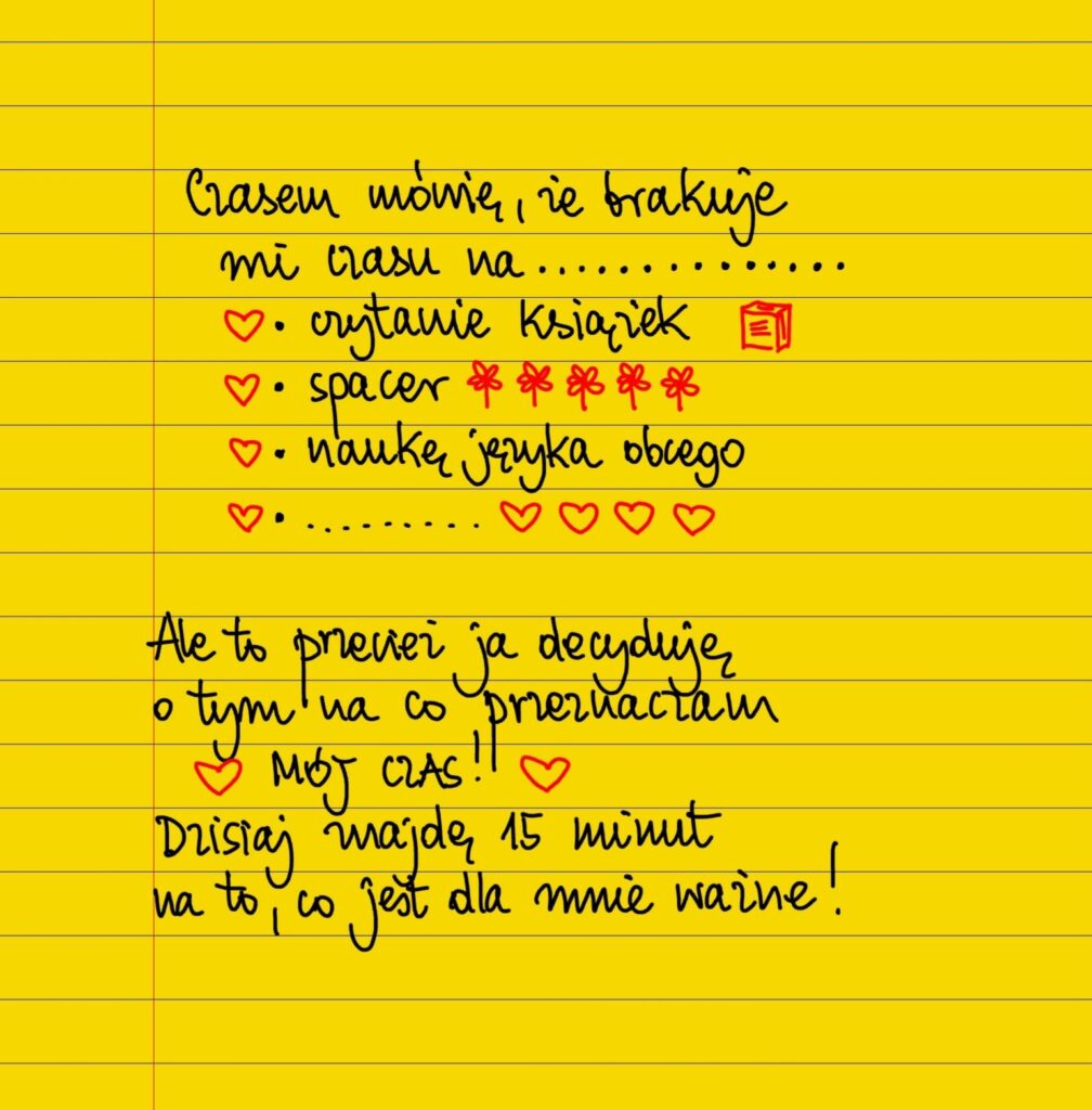 Czasem mówię, że brakuje mi czasu na czytanie książek, spacer, naukę języka obcego lub inne sprawy. Ale to przecież ja decyduję o tym na co przeznaczam MÓJ CZAS ❤ Dzisiaj znajdę 15 minut na to, co jest dla mnie ważne ❤ #żółtakartka #beatapawlikowska